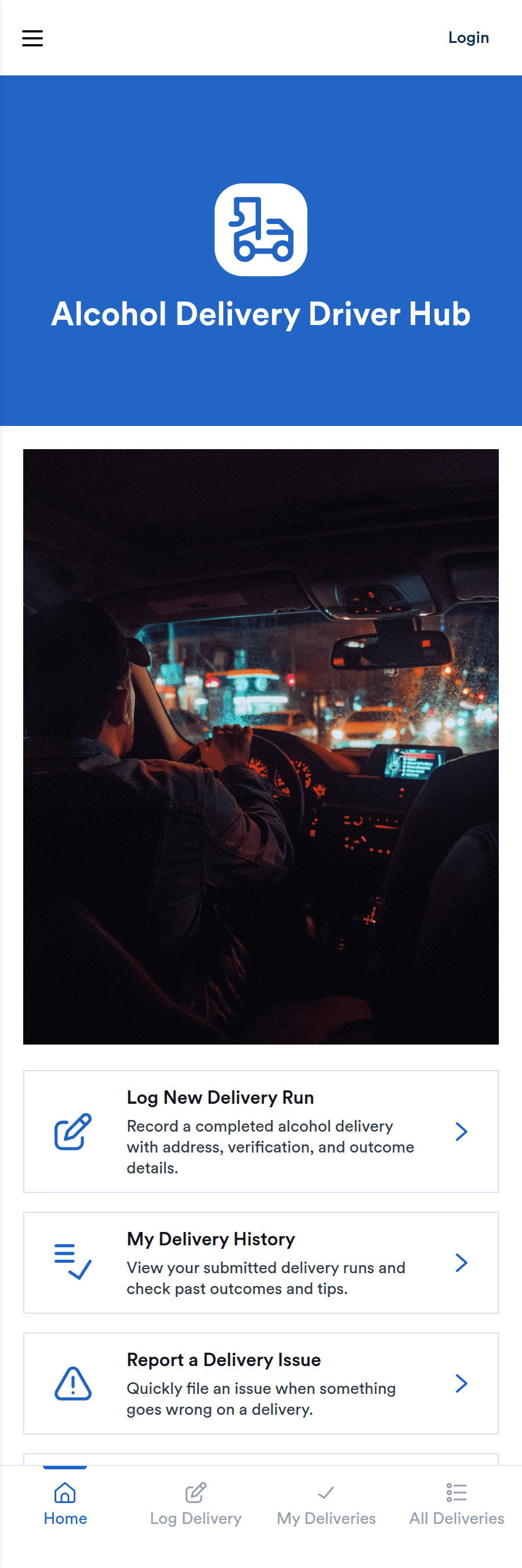 It’s used to give delivery drivers one place to record new delivery runs, look back on their own delivery history, and submit issue reports when something goes wrong on a route or order.