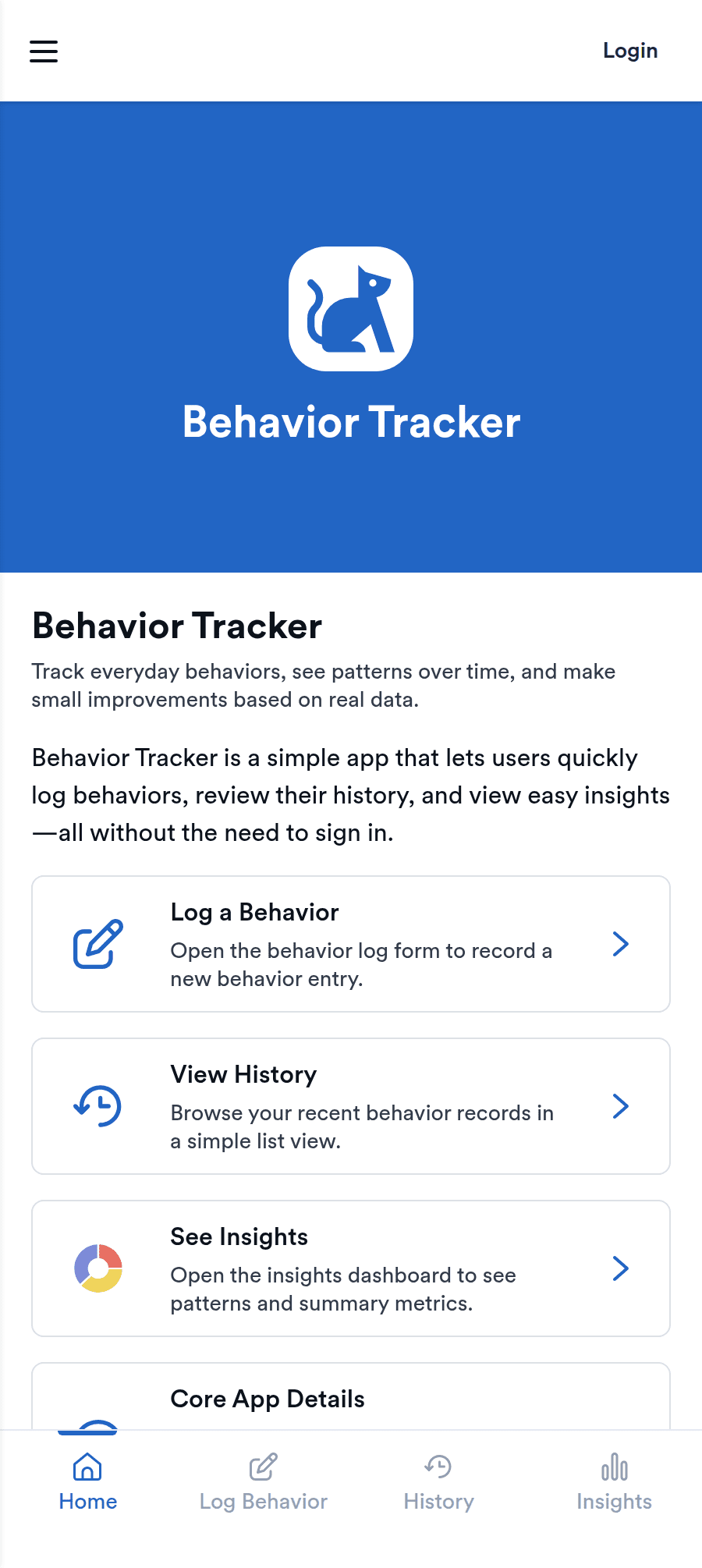 Behavior Tracker App helps individuals, caregivers, and support teams record behaviors in the moment and review patterns over time. Use it to log an incident quickly, keep a running history for each behavior, and add context and notes that make follow-ups more meaningful. It fits classrooms, at-home routines, coaching programs, and wellness check-ins where consistency matters and details can be easy to forget.