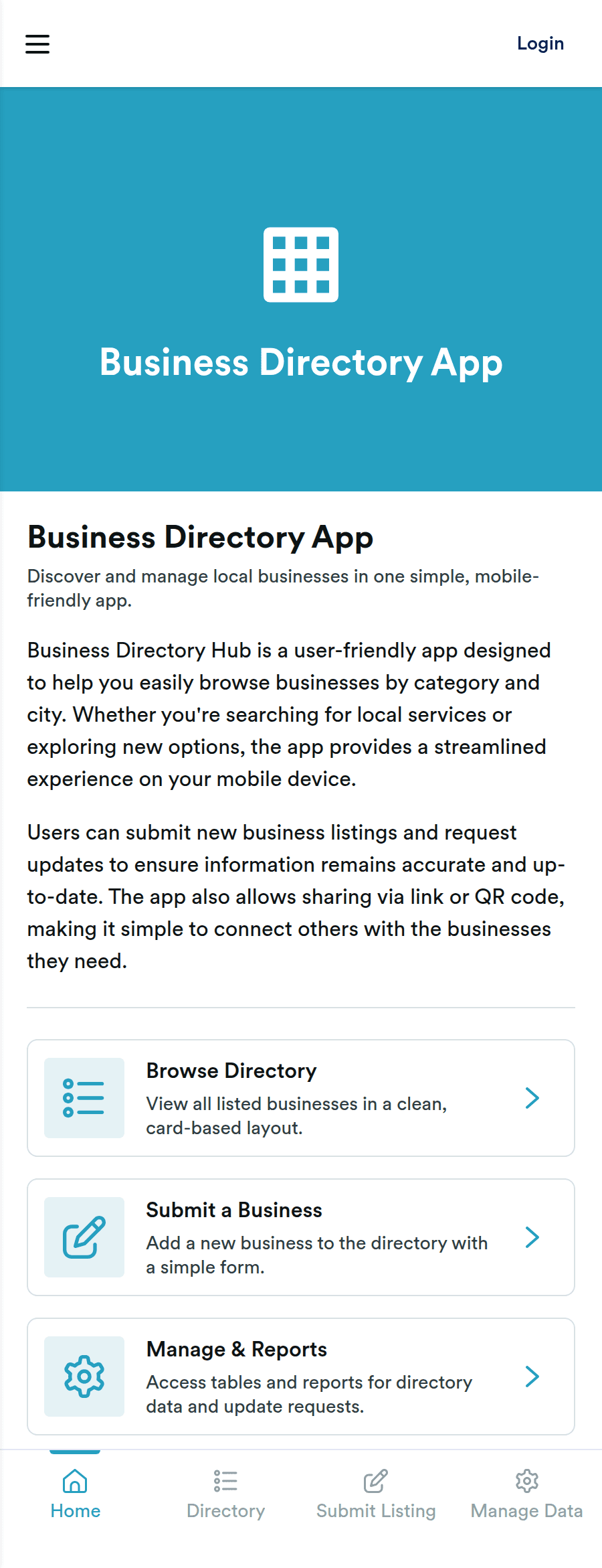 Business Directory App is an app template designed to efficiently organize and showcase business listings in a user-friendly interface, facilitating prompt discovery, search, and connection between users and businesses. Optimized for businesses, local directories, startups, and organizations, this app can be utilized in various operational contexts, from local commerce associations to startup ecosystems, aiming for a streamlined discovery process. The application collates essential business information into a structured layout, ensuring a comprehensive view of the business landscape. This enhances clarity, consistency, and completeness in data collection, while making the discovery process much easier compared to traditional methods. Common uses include rollouts for business associations, startup communities, and local chambers of commerce, and it is ideally suited for coordinators and administrators managing business ecosystems.