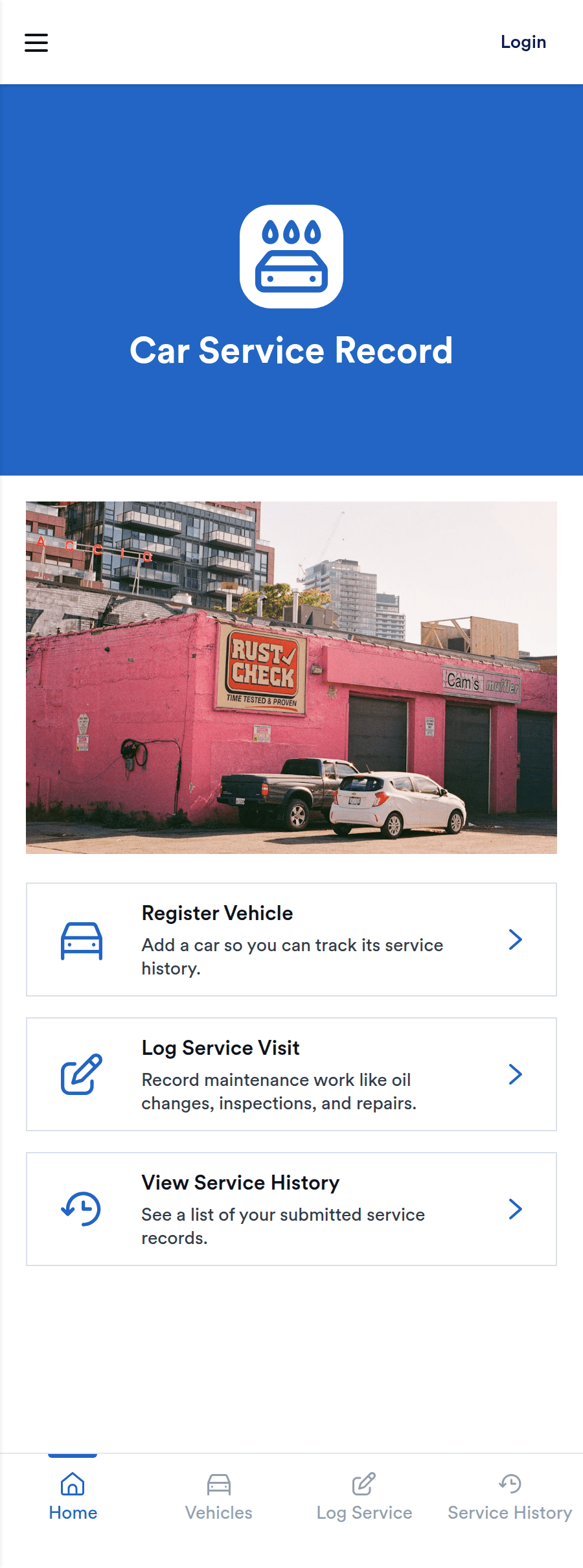 It’s used to keep vehicle information and maintenance records organized in one place, including registering vehicles, logging service visits, and viewing service history over time.