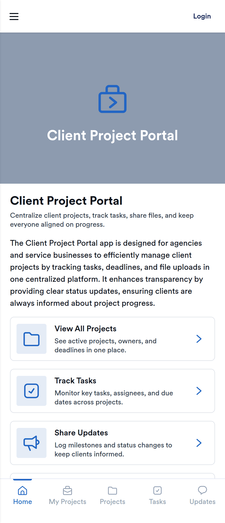 Client Project Portal is an app template designed to streamline project management and improve transparency between agencies, freelancers, service-based businesses, and their clients. This all-in-one platform brings together tasks, timelines, files, and updates, providing teams with a centralized system for managing ongoing client work. Users can seamlessly share progress, upload deliverables, and keep clients informed with status updates. The easy-to-read table view allows both teams and clients to quickly see project milestones, deadlines, and current status, while the dashboard provides a high-level overview of progress and next steps. This app is particularly beneficial for designers, developers, marketers, and consultants, but small teams also find value in the improved transparency and simplicity compared to complex project management systems.