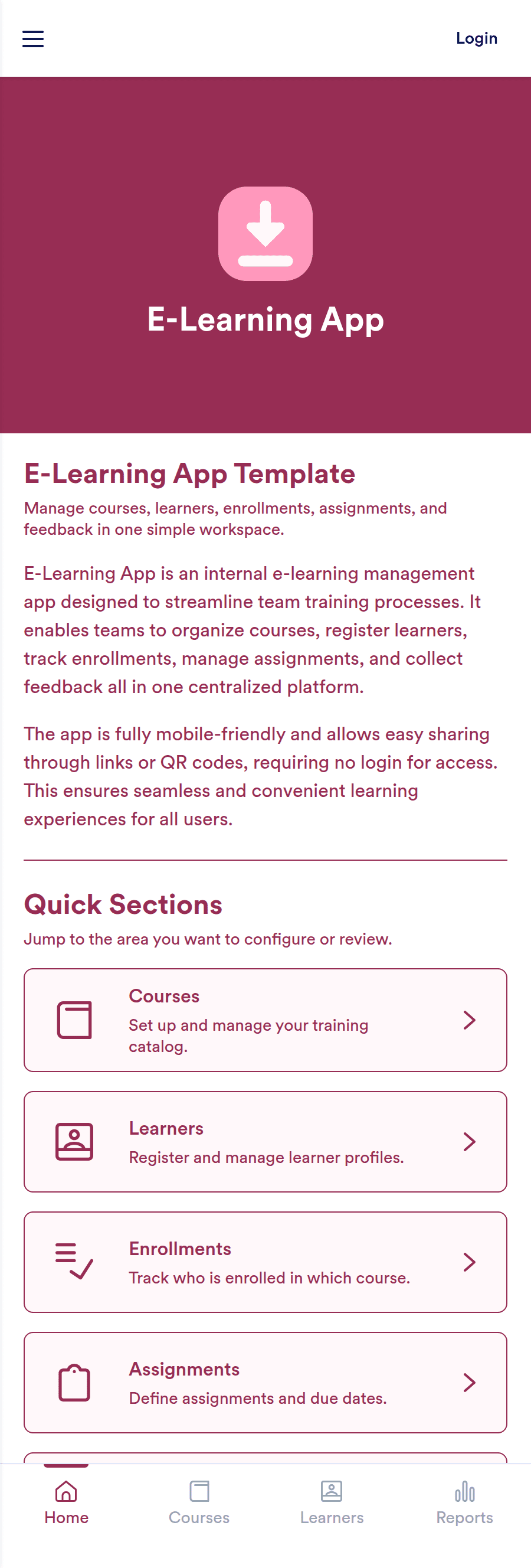 E-Learning App is an app template designed to foster the creation and management of online learning experiences, specifically tailored for educators, training providers, schools, and organizations. It provides a structured platform for the seamless delivery of educational content and training programs, creating a centralized hub for learning materials, assignments, quizzes, and discussions. The integrated data collection feature ensures the capture of vital learner data, such as enrollment details, progress tracking, and feedback, making it a comprehensive solution for educational and training workflows. It is commonly used for distance learning, corporate training, and continual professional development programs, and is best suited for those needing a ready-to-use, robust platform for delivering a streamlined e-learning experience.