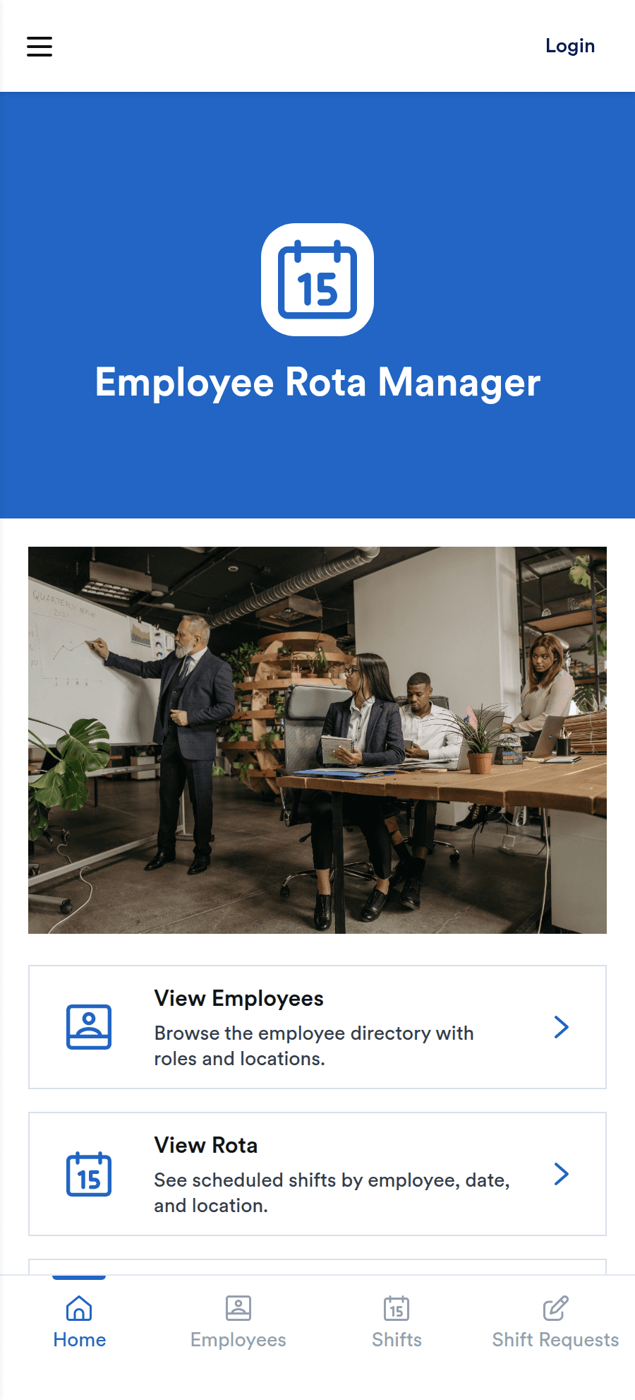 It’s used to centralize employee scheduling, giving staff a place to view the employee directory, check the rota, and submit shift change requests without relying on scattered messages.
