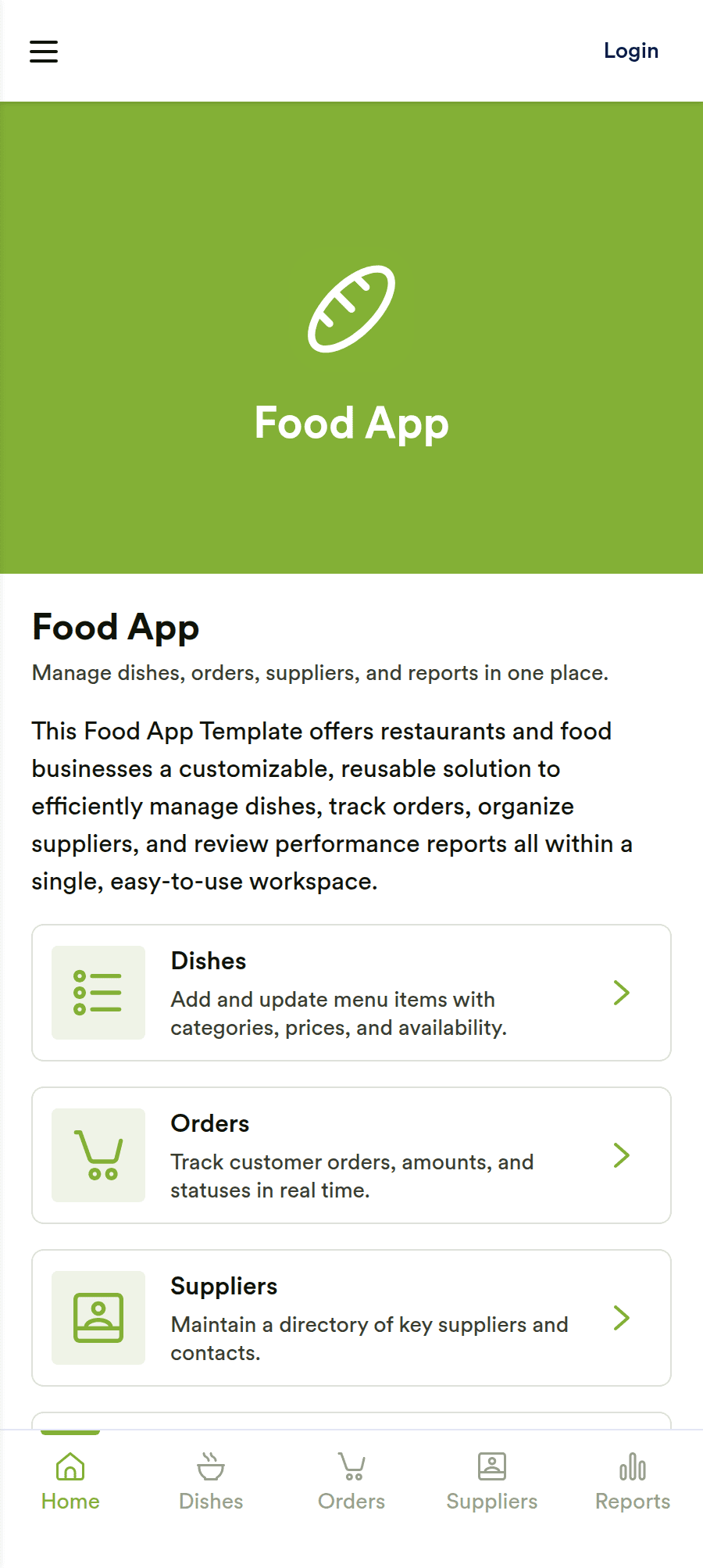 Go to Category:Booking AppsA restaurant management app for internal use makes it easier to track inventory, manage staff, and keep your restaurant running smoothly. No matter what type of cuisine your restaurant serves, build your own app with our free Restaurant Management App template. This pre-made template keeps opening and closing checklists and manager review forms in one place. Members of your staff will be able to open and download the app onto any smartphone, tablet, or computer.Customize this Restaurant Management App for your restaurant in just a few clicks. No coding necessary — simply drag and drop to add or delete forms, text, images, links, and much more. When it’s ready, you can download the app onto any device or share it with members of your staff to save onto their own devices. You’ll receive form entries instantly in your secure Jotform account. Manage all restaurant operations from one place with a fully-custom Restaurant Management App.