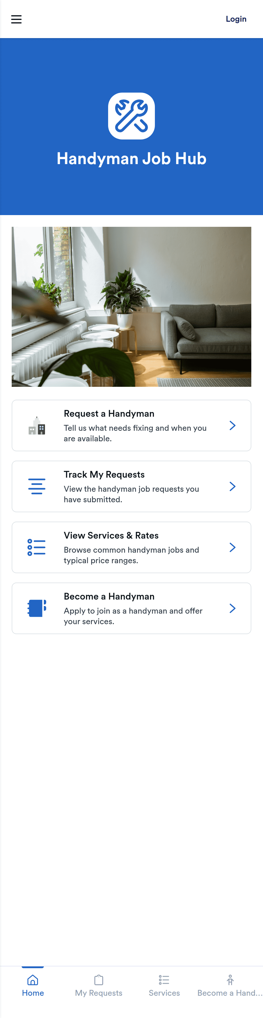 Handyman Job Hub App brings your service requests, pricing info, and contractor recruitment into one mobile-friendly hub. Customers can request a handyman from a single entry point, check typical services and rates before booking, and follow up by tracking request status in one place. It works well for local handyman businesses, property managers, HOAs, and facility teams that need a clear way to route incoming jobs, reduce missed details, and keep clients informed without constant calls or texts.