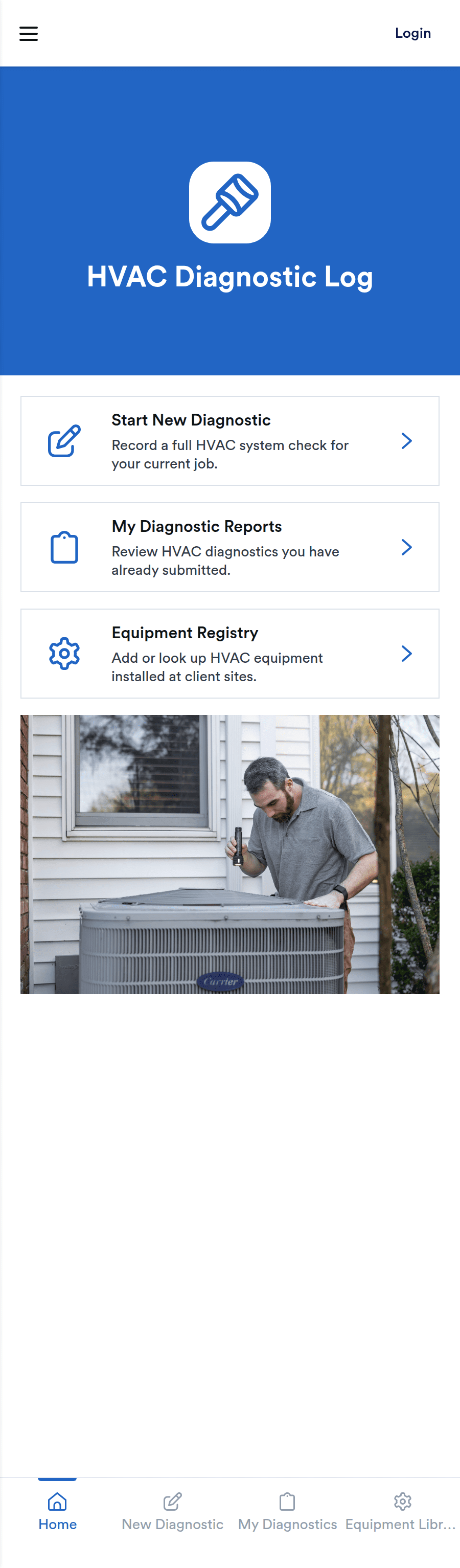 It’s used to help HVAC teams record new diagnostic reports, revisit previously submitted diagnostic entries, and maintain an equipment registry from a single, easy-to-navigate app.