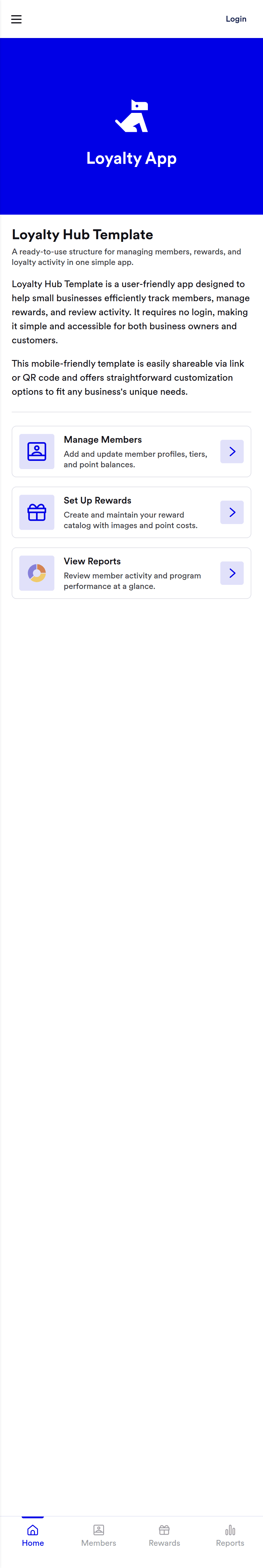 Loyalty App is a app template designed to create a structured loyalty system, allowing businesses, retailers, restaurants, and brands to reward repeat customers, track participation, and maintain ongoing customer engagement. In the fast-paced, competitive landscape of today's market, keeping customers engaged and loyal is a fundamental aspect of business success. That's where the Loyalty App shines, centralizing your loyalty program and making it accessible through a user-friendly mobile interface. The app collects and manages data such as customer details, transaction records, reward points, and redemption history, ensuring clarity, consistency, and completeness. Ready to use out of the box, this template is perfect for those looking to streamline their loyalty program, making it the ideal choice for businesses that value recurring customers.