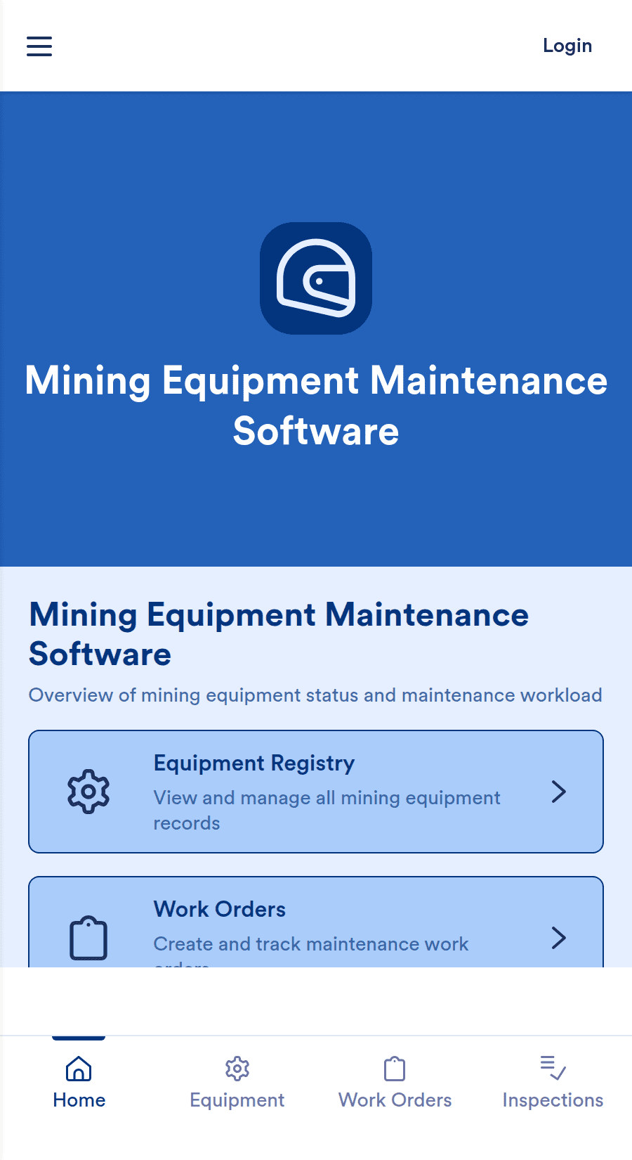 Mining Equipment Maintenance Software is an app template designed to meticulously track, schedule, and manage maintenance activities for mining equipment. This advanced template is key to supporting safe, continuous operations by reducing downtime and maintaining heavy machinery reliability. Primarily used by mining companies, site managers, maintenance teams, and industrial operations staff, it provides a comprehensive solution for capturing vital data regarding equipment health, maintenance schedule, and periodic inspections. The template offers a distinct edge by promoting precision, consistency, and ease in data collection, therefore, eliminating the ambiguity often associated with ad-hoc methods. It is particularly beneficial in high-stakes mining operations where equipment reliability is paramount to safety and productivity.