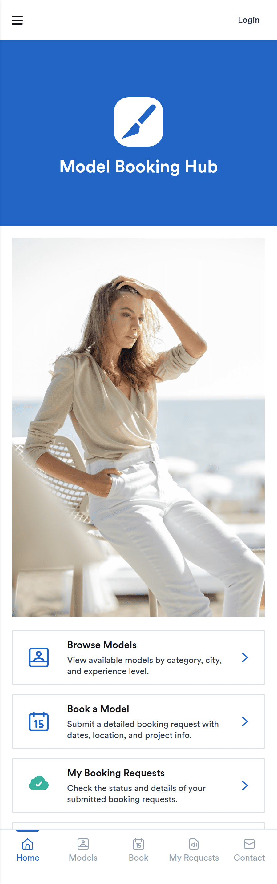 A strong setup typically includes a directory of models for browsing, a booking request form to capture key project details, and a place for requesters to view their booking requests. Many teams also include a contact page so prospects know where to reach the agency.