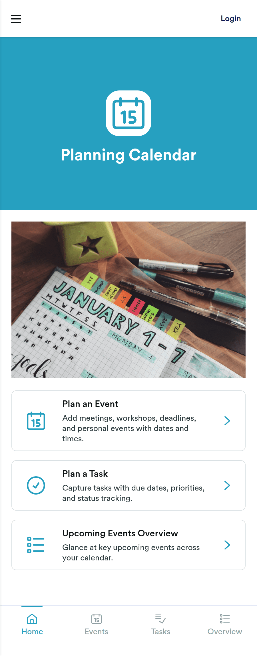 Planning Calendar App brings your events and tasks into one place so you can plan ahead, capture details quickly, and stay focused on what’s next. It works well for busy professionals, teams coordinating internal schedules, educators managing class activities, and organizers juggling multiple deadlines. Use the built-in navigation cards to jump into planning an event or planning a task, then review what you’ve already created through dedicated areas for planned events and planned tasks. For anyone who needs a practical planning calendar without complicated setup, this app template supports clearer prioritization and fewer missed commitments.