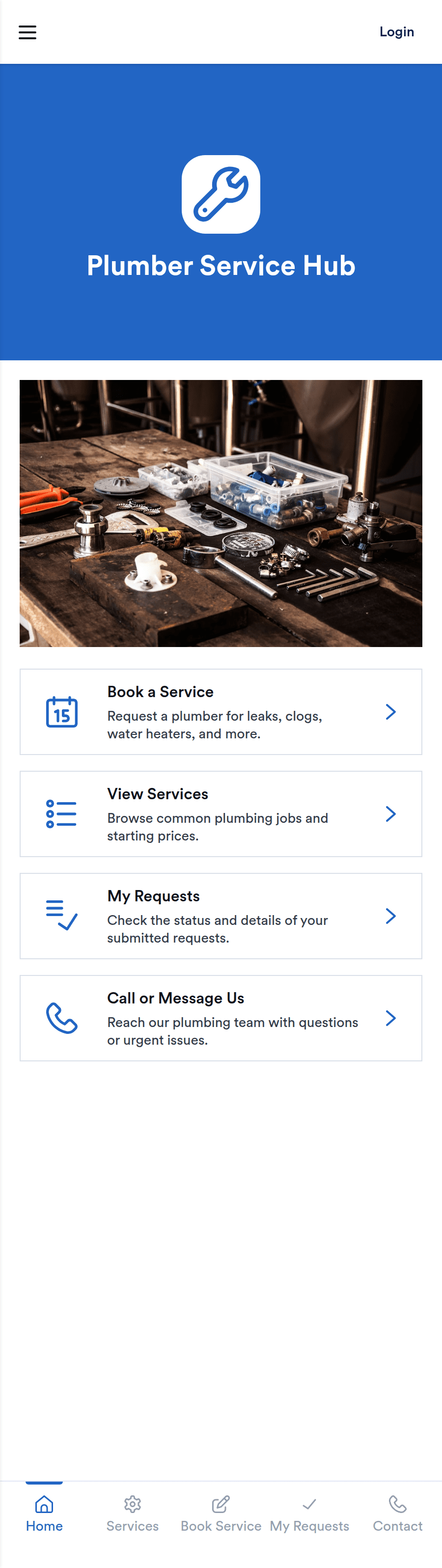 Plumber Service Hub App gives plumbing companies a simple self-service hub customers can use to browse services, book a visit, and follow up on open requests without extra phone tag. It works well for residential plumbers, small service teams, and multi-tech operations that need a clear front door for scheduling and support. Customers can quickly jump to booking, review what you offer, and check “My Requests” to see what they’ve already sent in, which helps reduce repeat calls and missing details while keeping every job moving.