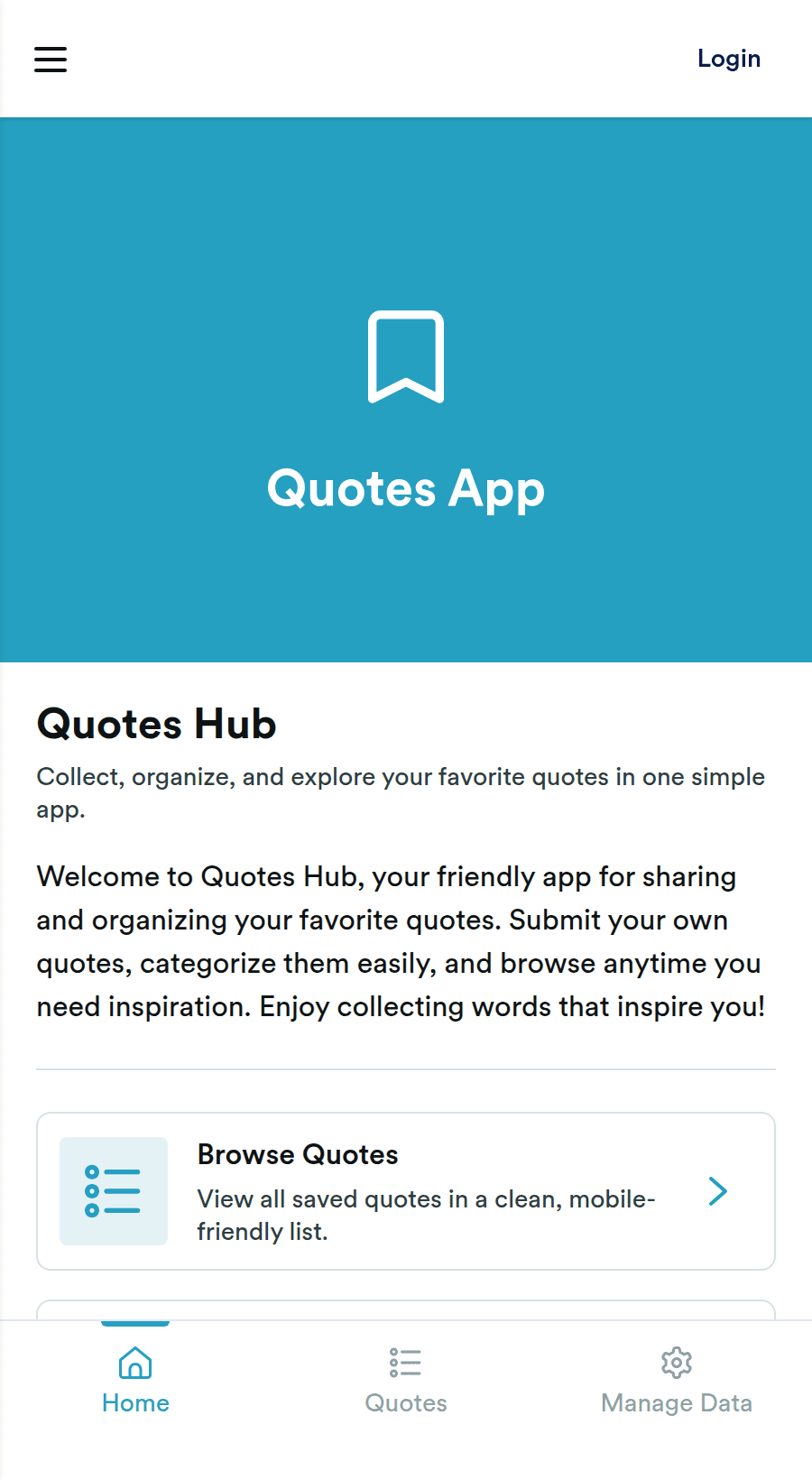 Quotes App is an app template designed to flawlessly display, organize, and share quotes, providing an efficient method for content creators, app developers, marketers, and organizations to engage their audience with curated content. This app offers a practical solution to managing an extensive collection of quotes, eliminating the inconvenience of ad-hoc collection while improving clarity, consistency, and completeness. It is best suited for service providers and agencies that require an intuitive platform for sharing inspirational, informational, or promotional quotes. With its easy-to-use interface, the Quotes App allows you to capture and showcase your favorite quotes, adding a personal touch to your professional presentations or marketing campaigns.