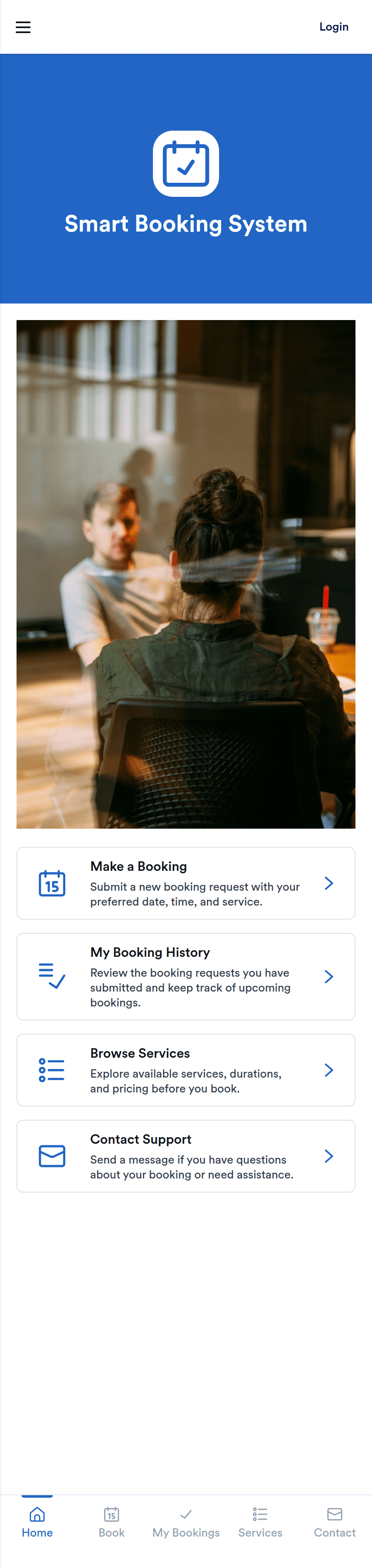 Smart Booking System App gives service-based businesses a simple way to take appointment requests, help customers explore offerings, and keep everything organized in one place. Visitors can make a booking, browse available services, and reach out for help from a dedicated support page, which works well for salons, personal trainers, consultants, clinics, home services, and any team that schedules time-based services. With a clear booking history area, customers can revisit past requests, reduce repeat questions, and feel confident about what they’ve already submitted.