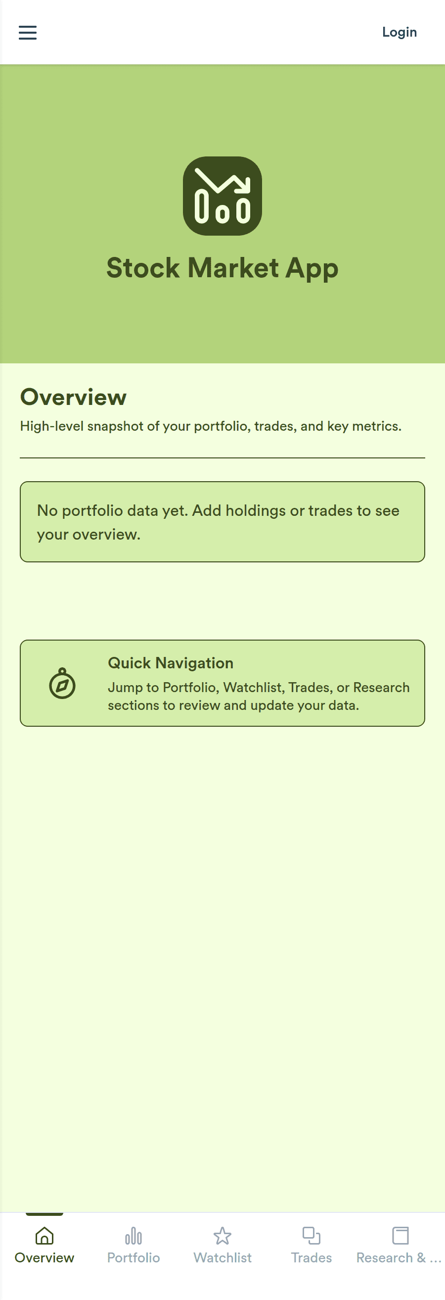 Stock Market App is an app template designed to centralize and streamline financial data collection for financial service providers, fintech startups, investment platforms, and organizations. Its main purpose is to serve as a reliable platform for tracking stock market activity, monitoring investments, and providing users with a comprehensive view of their financial information in one system. With its ready-to-use functionality, this app template is an efficient solution for financial coordinators seeking to eliminate scattered data sources and bring consistency to their investment monitoring processes. The Stock Market App collects relevant financial data, making it a must-have for firms looking to simplify and optimize their investment tracking, especially in an environment of fast-paced stock market dynamics.