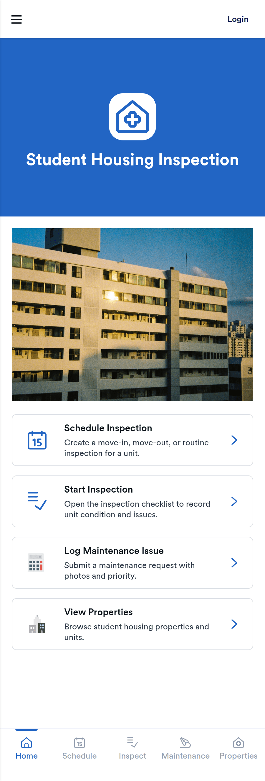 Student Housing Inspection App helps housing teams coordinate unit inspections across student residences while keeping schedules, inspection activity, and maintenance follow-ups in one place. Use it to schedule upcoming inspections, start an inspection on-site, and log maintenance issues the moment they’re found, so campus housing staff, property managers, and contracted inspectors can stay aligned across multiple properties and units. It’s a practical fit for routine move-in and move-out checks, semester walkthroughs, safety spot checks, and recurring condition reporting when you need consistency without juggling emails or scattered notes.