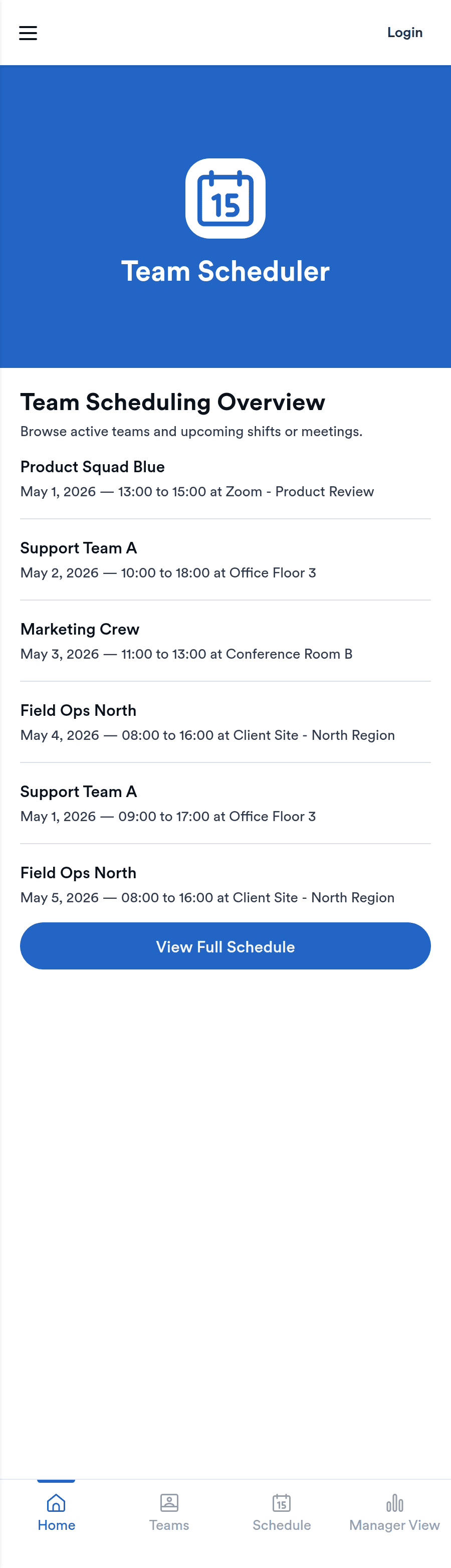 Team Scheduler App brings team schedules and a simple teams directory into one place, making it easier for managers and coordinators to see who is working, confirm coverage, and keep teams aligned across shifts and projects. With an at-a-glance scheduling overview, a directory for browsing teams, and quick navigation to view a full schedule, it supports day-to-day planning for departments, field teams, agencies, schools, and service organizations that need clear visibility without messy spreadsheets or long message threads.
