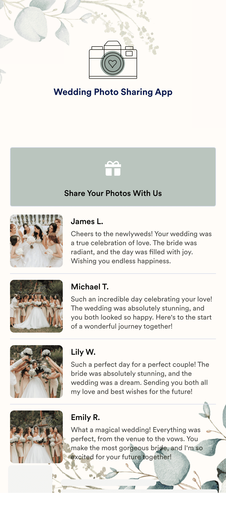Wedding Photo Sharing App allows you to share and relive beautiful wedding moments with others. It encourages guest interaction and provides a centralized location for all wedding photos.