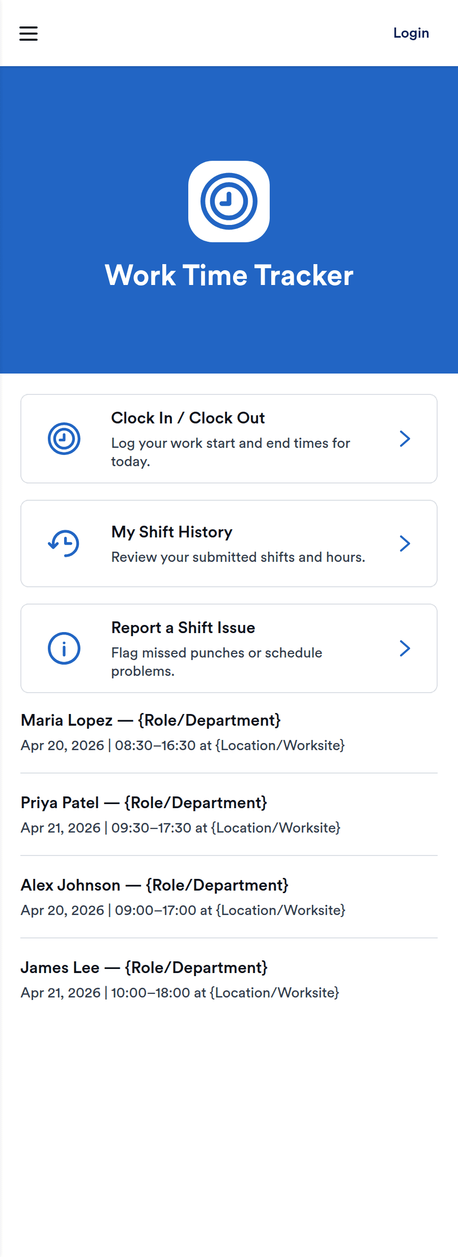 Work Time Tracker App gives teams a simple way to record shifts, review time worked, and flag problems fast. Employees can clock in and clock out in one place, check My Shift History for past entries, and submit a quick form when something is off, such as a missed punch or incorrect role. It fits hourly workplaces like retail, restaurants, field services, and growing operations teams that need cleaner time records without chasing updates across channels.
