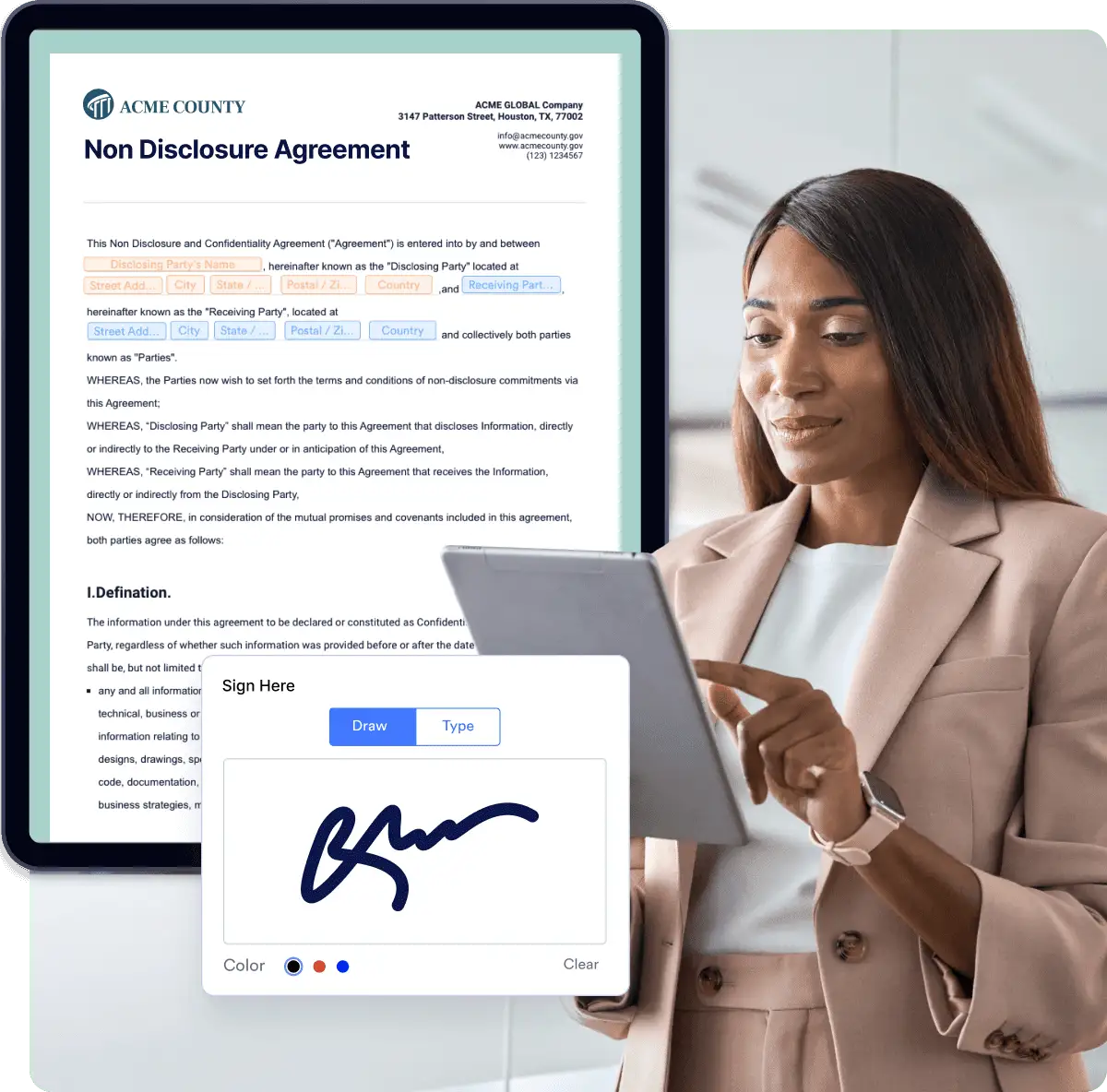 أنشئ مستندات التوقيع الإلكتروني لكل قسم في مؤسستك باستخدام Jotform Sign — الحل القوي للتوقيع الإلكتروني من Jotform Government. أضف عدة موقعين، أرسل رسائل تذكير تلقائيًا، وفوض سلطة التوقيع حسب الحاجة.