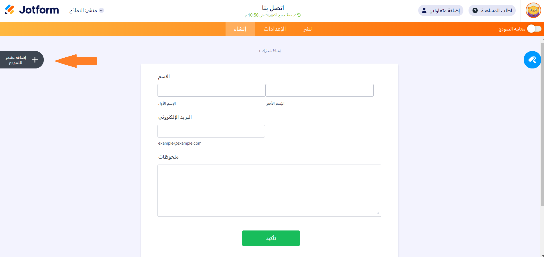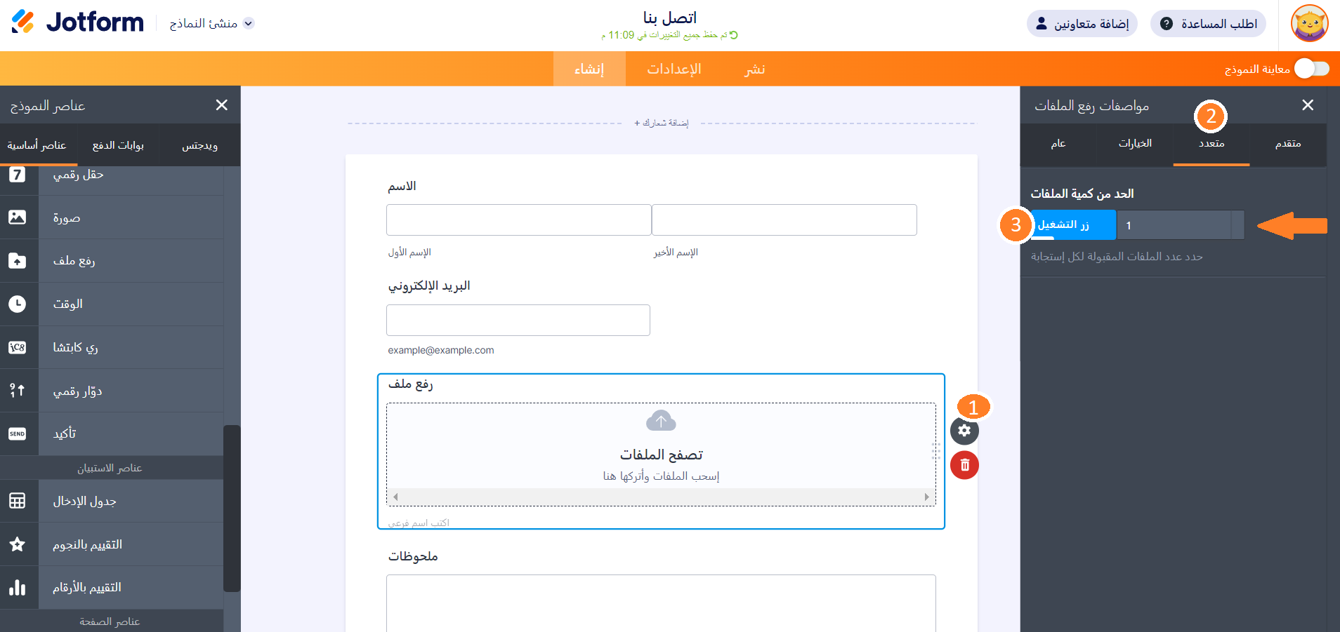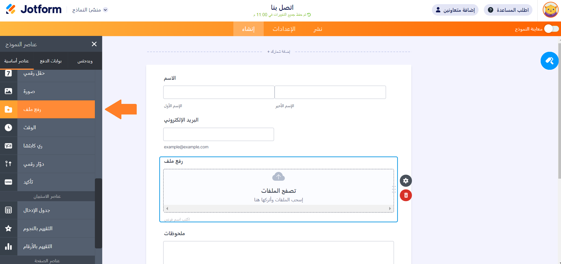 فيما يلي كيفية إضافة رفع ملف إلى نموذجك: