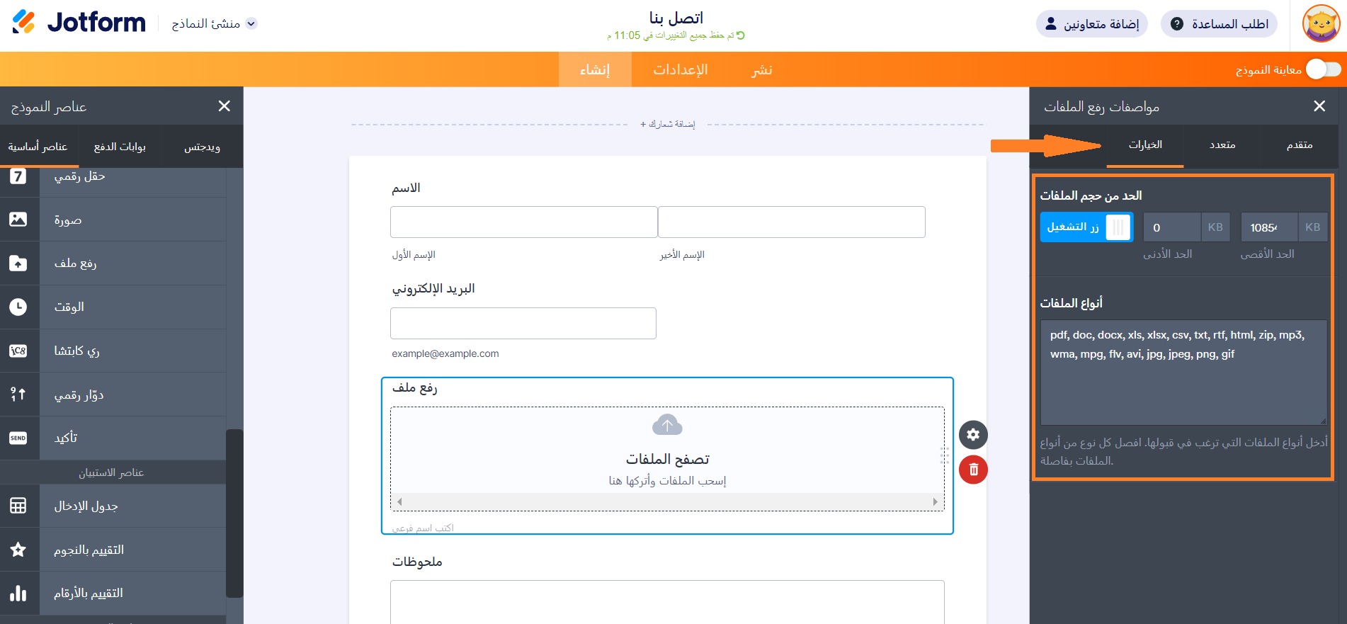 5. أخيرًا، قم بتفعيل حد حجم الملف المطلوب وأنواع الملفات المسموح بها في الحقول.