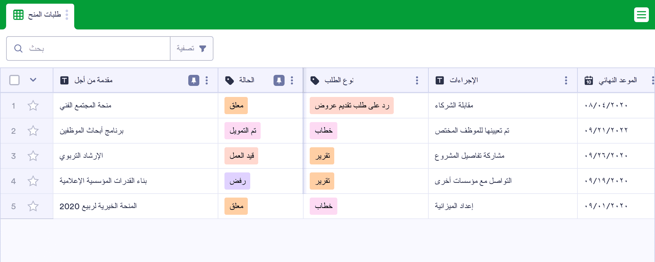 جدول بيانات تتبع المنح هو جدول بيانات عبر الإنترنت يُستخدم لتتبع طلبات المنح. يمكنك استخدام جدول بيانات تتبع المنح المجاني عبر الإنترنت الخاص بـ Jotform لمراقبة حالة طلبات المنح السارية، وإدارة تفاصيل جهات الاتصال، وتنظيم المعلومات للتقدم بطلب للحصول على المنح عندما تحتاج إلى الحصول على مبلغ التمويل المناسب. يمكنك حتى تبديل طريقة العرض إلى عرض التقويم لضمان عدم تفويت أي موعد نهائي مهم!