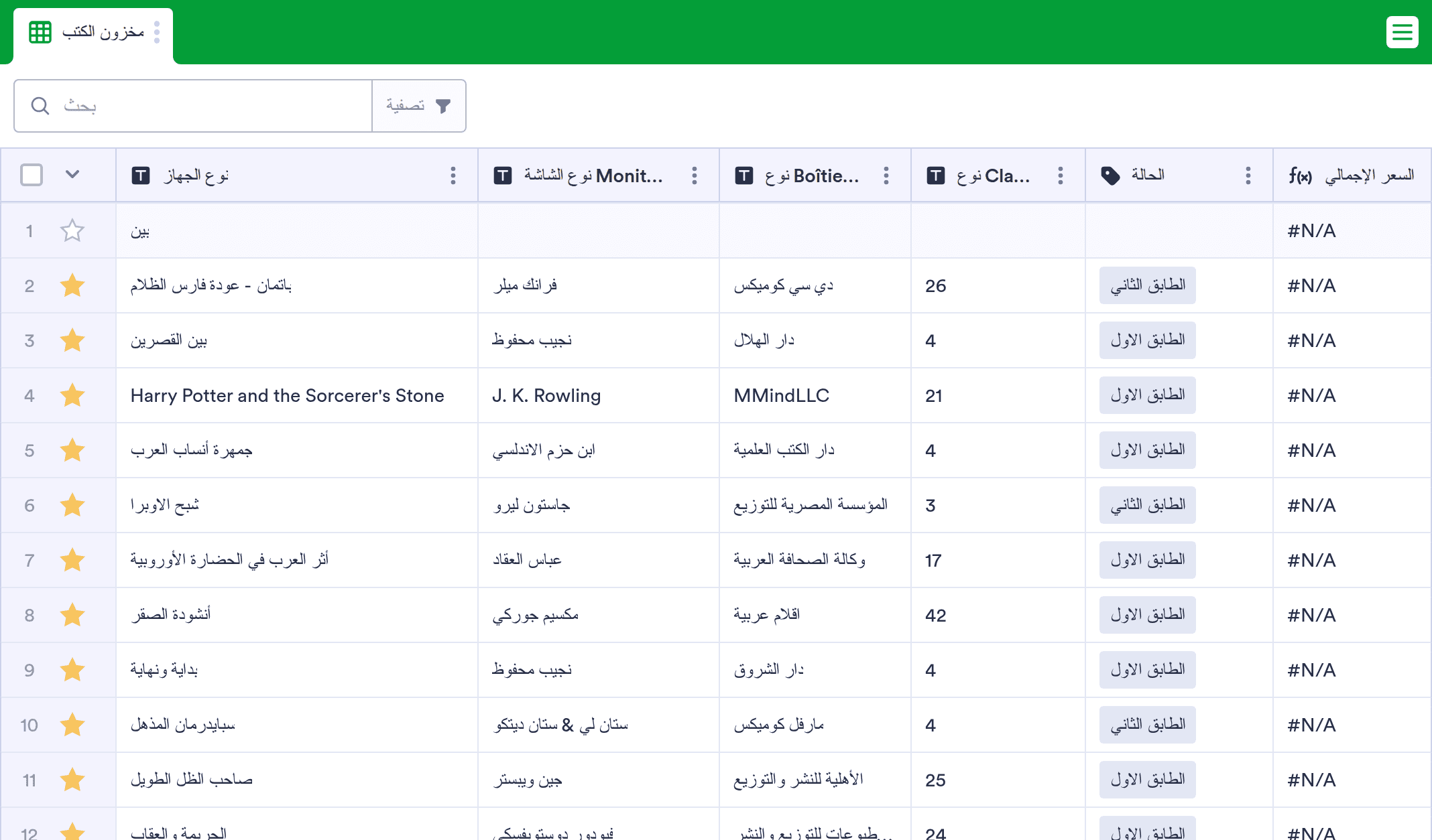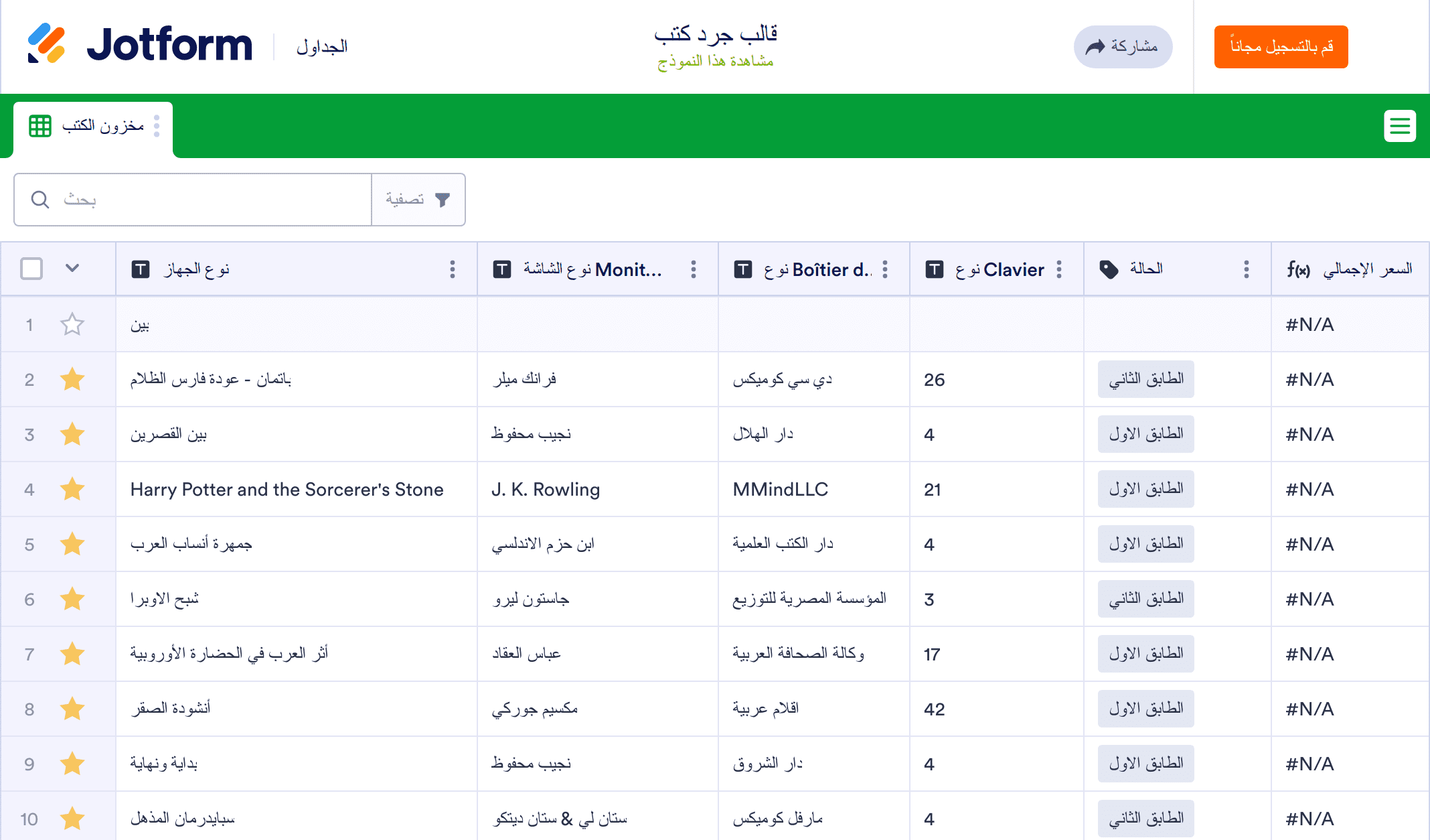 يقوم قالب جرد الكتب بتسجيل كمية الكتب الموجودة حاليًا في المتجر أو المكتبة أو المجموعة. سواء كنت مالكًا لمكتبة مستقلة أو أمين مكتبة مدرسة أو محب للقراءة مع مجموعة شخصية كبيرة ، فإن قالب جرد الكتب المجاني الخاص بنا سيساعدك على تتبع كل عناوين الكتب المتاحة بشكل أفضل. ما عليك سوى إدخال تفاصيل كل كتاب - مثل العنوان والمؤلف والموقع والكمية - في نموذج جرد الكتاب الخاص بك لإنشاء جدول بيانات ذي شكل مذهل والذي يحتوي على جميع المعلومات التي تحتاجها. فيمكنك بعد ذلك عرضها على أي جهاز وتنزيلها كملف CSV أو Excel أو PDF لسجلاتك.