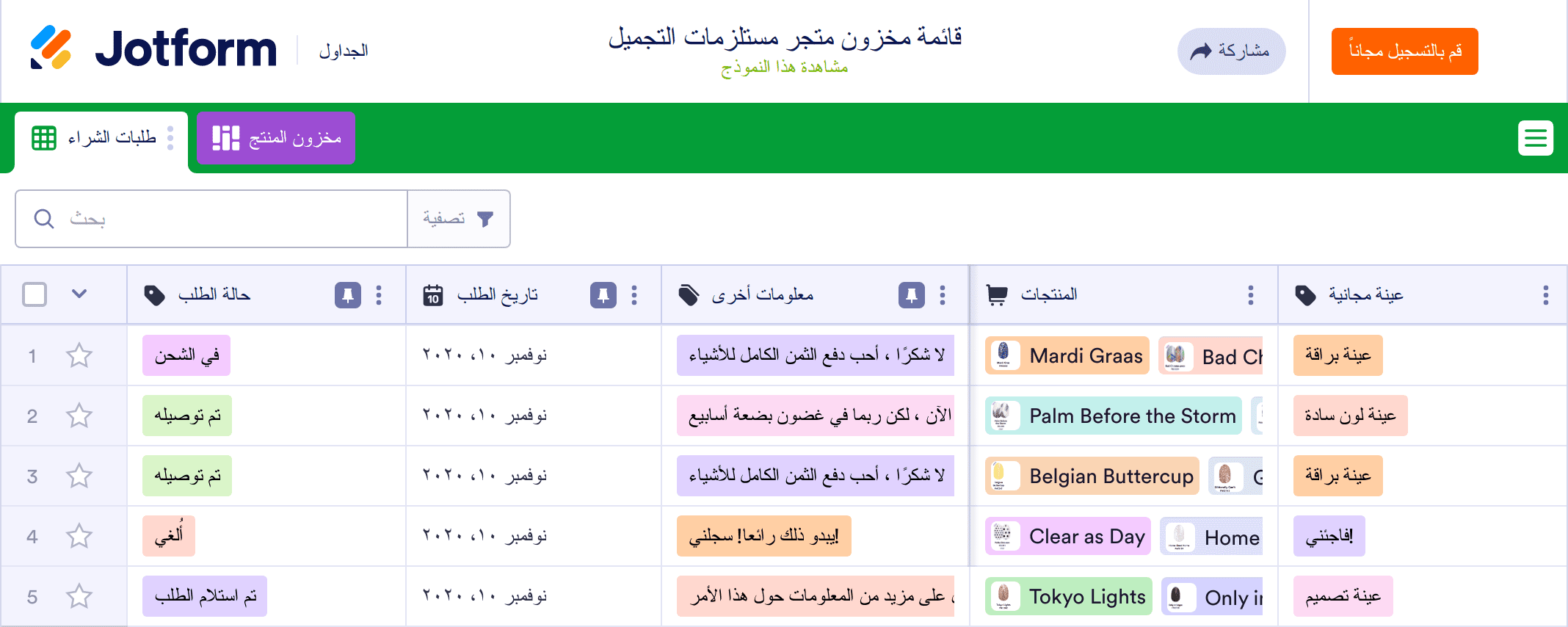 قم بتتبع كل منتج تملكه وتبيعه في متجر مستلزمات التجميل الخاص بك. تابع المخزون وقم بإدارة الطلبات عبر الإنترنت من خلال قائمة مخزون متجر مستلزمات التجميل المجانية! ما عليك سوى ملء قائمة مخزون متجر مستلزمات التجميل يدويًا عند إجراء الجرد ، أوقم بملء نموذج المخزون المرفق لمزامنة عمليات التسجيل تلقائيًا مع جدول البيانات الخاص بك. يمكنك أيضًا إرفاق نموذج طلب عبر الإنترنت والذي على الفور سيعيد توجيه معلومات الطلب إلى الجدول أيضًا. سيكون بإمكانك مراقبة منتجات الشعر ومستحضرات التجميل والعناية بالبشرة ومنتجات الأظافر في متجر مستلزمات التجميل الخاص بك والمزيد.