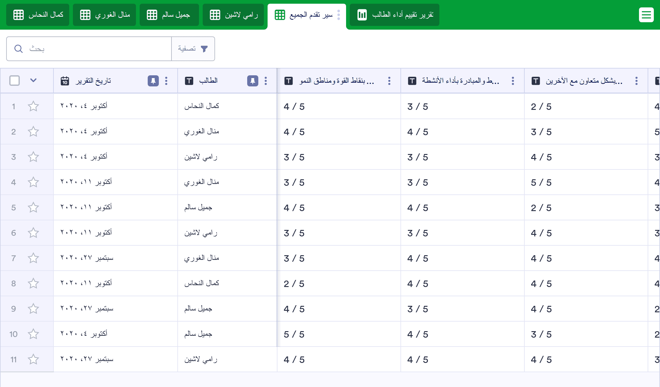 إن سجل متابعة سير تقدم الطالب هذه مقسم إلى علامات تبويب مختلفة لكل طالب من طلابك على حدة، ولكن لا تتردد في تخصيص القالب ليعمل بشكل أفضل بالنسبة لك. يمكنك إضافة صفوف وأعمدة، وإنشاء علامات تبويب للطلاب الجدد، وإعداد عوامل تصفية و معادلات متقدمة لتنظِّم لك بياناتك تلقائيًا. ستتمكن أيضًا من تبديل طريقة العرض من عرض الجدول إلى عرض التقويم أو عرض البطاقة أو عرض التحميل حتى تتمكن من رؤية بياناتك بالطريقة التي تريدها بالضبط. لن تكون إدارة بيانات الطلاب عبر الإنترنت معقدة بفضل استخدام سجل متابعة سير تقدم الطلاب المخصص عبر الإنترنت لفصلك الدراسي!