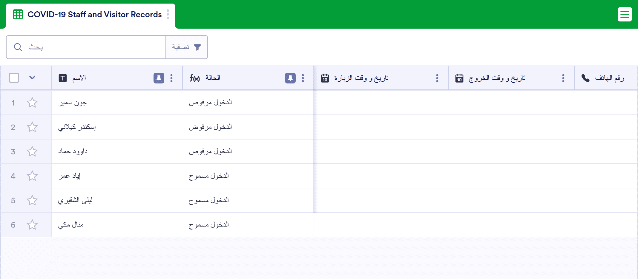 يتم استخدام صحيفة سجل كوفيد-19 من قبل مؤسسات الرعاية الصحية لتتبع كل شخص يدخل المبنى، مما يجعل تتبع الاتصال أسهل ويعمل على تقليل انتشار كوفيد-19. احتفظ بسجل شامل للزوار باستخدام صحيفة سجل كوفيد-19 المجانية عبر الإنترنت من Jotform! قم بملء الجدول يدويًا، أو اطلب من الأشخاص القيام بإدخال معلوماتهم في نموذج كوفيد-19 للموظفين وسجل الزوار المرفق مع الجدول. سيتم بعد ذلك ملء البيانات المُدخلة تلقائيًا في جدولك عبر الإنترنت، ليسهل الوصول إليها ومشاركتها على أي جهاز.
