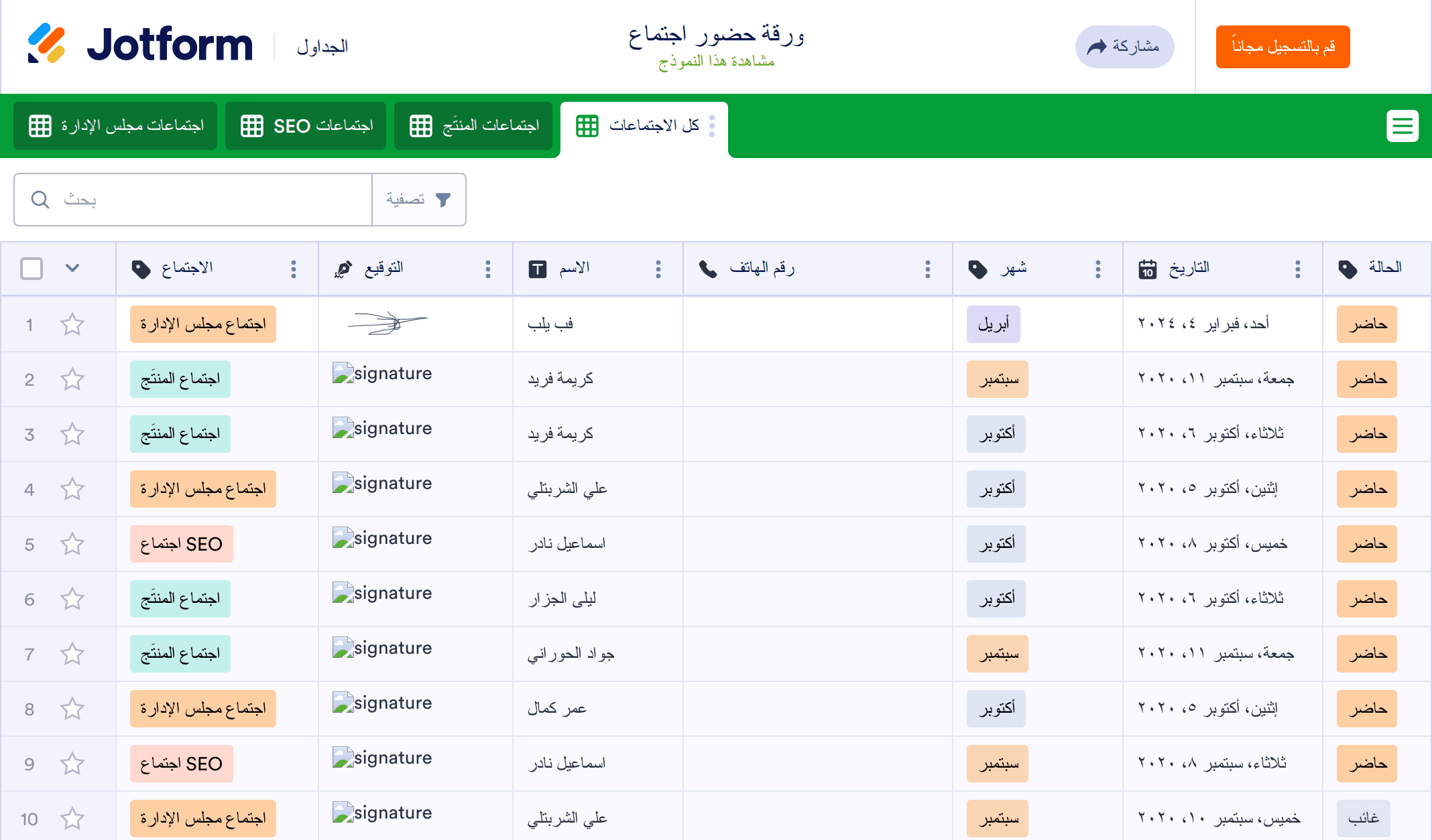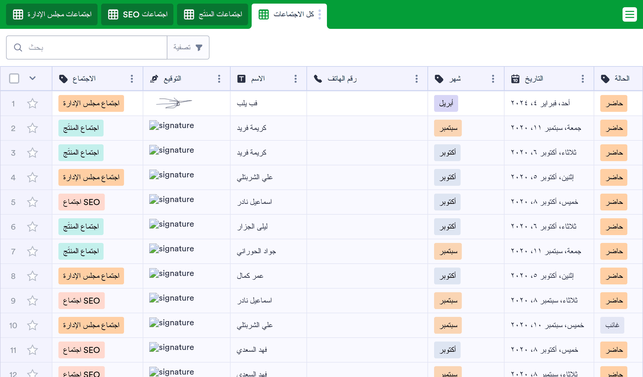 بسهولة قم بتتبع حضور الموظفين في اجتماعات شركتك من خلال ورقة حضور الاجتماع المجانية عبر الإنترنت! بواسطة إدخال تفاصيل الحضور بسرعة في جدول البيانات الرقمي الاحترافي هذا، يمكنك تخزين ومراقبة سجلات الحضور على مستوى الشركة بدون كتابة أي كود - وهو ما يعد مثاليًا لأقسام الموارد البشرية والسكرتارية والمديرين وغير ذلك. يمكنك أيضًا تنزيل كشف حضور الاجتماع كملف CSV أو PDF أو Excel للاحتفاظ بنسخة ورقية لسجلاتك بدون اتصال بالإنترنت!