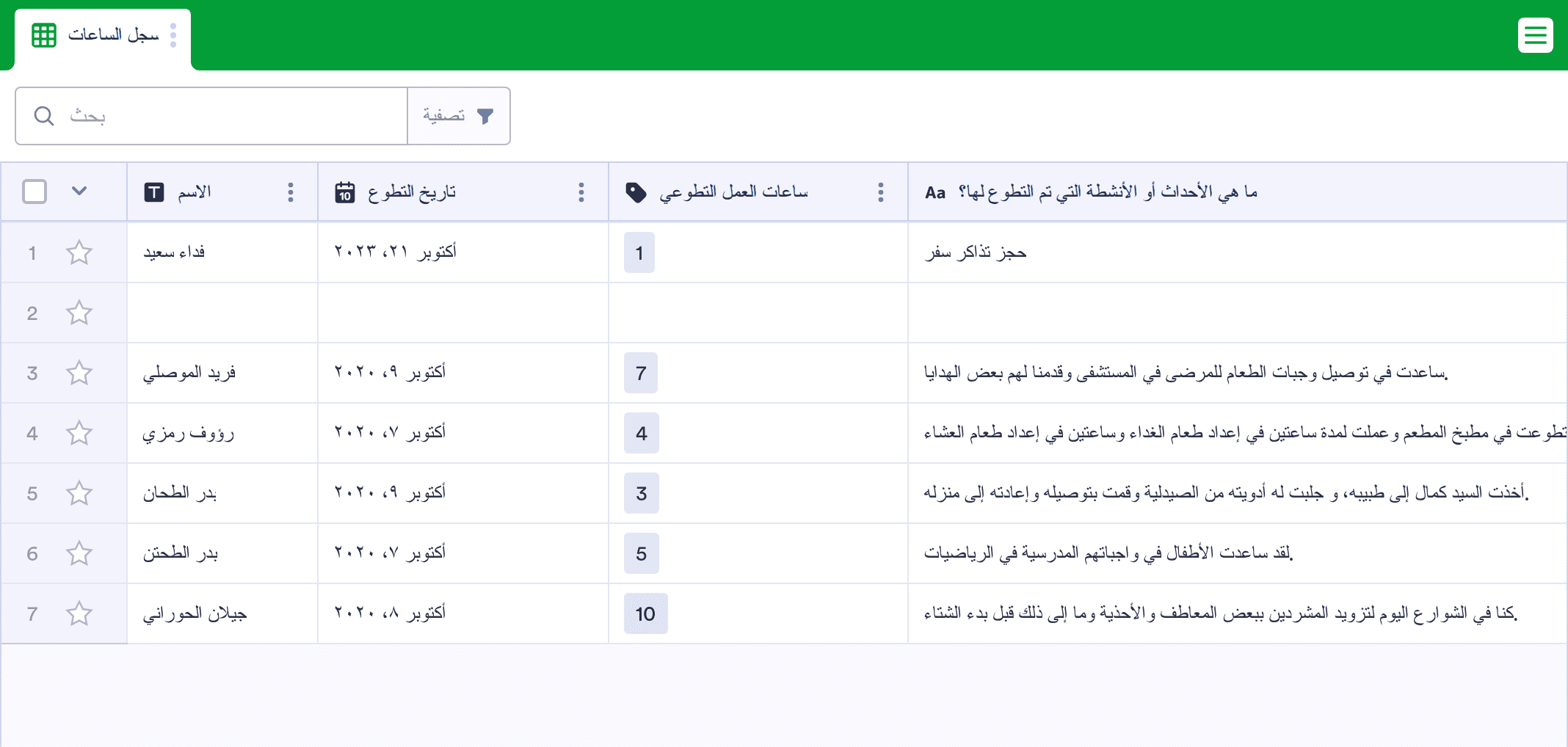 ليس فقط يمكنك اختيار عرض معلوماتك في طريقة عرض جدول بيانات أو بطاقة أو تقويم، ولكن يمكنك أيضًا تحديث جدولك بأعمدة مُعدة مسبقًا، أو تقسيم المعلومات إلى علامات تبويب منفصلة، أو معلومات تصنيف باستخدام عناوين مرمزة بالألوان! مع تخزين جميع معلومات المتطوعين للأعمال الغير الربحية على الإنترنت، يمكنك أنت وفريقك مشاركة الجدول الخاص بك والوصول إليها من أي جهاز. قم بتحسِن إدارة المتطوعين لديك وقم بتسريع سير عملك باستخدام ورقة سجل ساعات العمل التطوعي المجانية هذه - حتى تتمكن من توفير الوقت الذي تقضيه بشكل أفضل في إنجاز مهمة مؤسستك الخيرية.