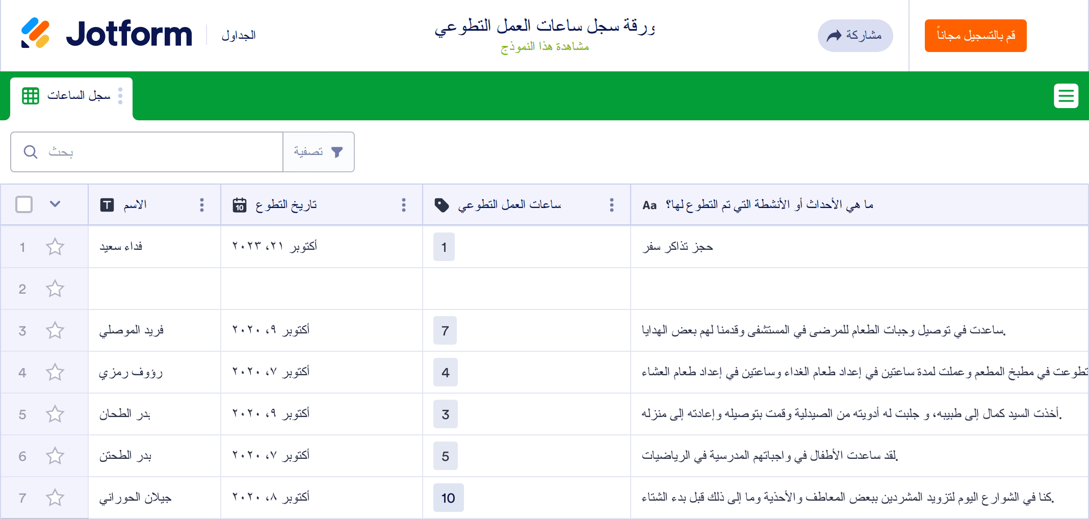 تُستخدم ورقة سجل ساعات العمل التطوعي لحفظ سجل معلومات المتطوعين للأعمال الخيرية أو الغير ربحية وكذلك عدد ساعات العمل التي يساهم بها كل متطوع. باستخدام ورقة سجل ساعات العمل التطوعي المجانية عبر الإنترنت من Jotform، يمكنك جعل المتطوعين بملء نموذج تسجيل ساعات المتطوع المرفق، أو جعل أحد أعضاء فريقك القيام بإدخال ساعات العمل التطوعي يدويًا، أو تحميل ملف CSV أو Excel موجود للاحتفاظ بجميع ساعات العمل التطوعي الخاص بك في حساب آمن عبر الإنترنت. قم بمتابعة الساعات وتفاصيل الاتصال ووصف المهام والمزيد.
