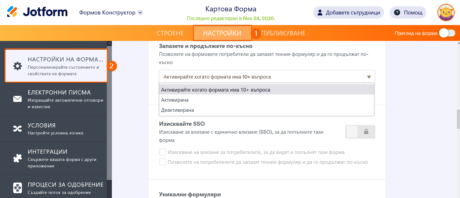 Обърнете внимание, че тази функция не работи на форми с по-малко от 4 полета. Освен това бутона за запазване ще се появи само след като потребителя попълни поле във вашата форма. Всичкия запазен напредък или сесии се появяват като Непълни подадени формуляри Jotform Таблици.
