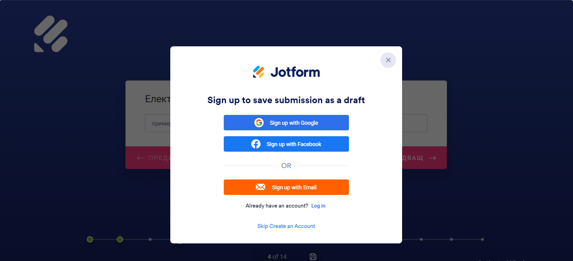 За потребители, които са излезли или нямат Jotform акаунт, избирането на Запази ще покаже диалогов прозорец, където могат да се регистрират или да влязат в Jotform, за да запазят техния линк на сесията. Те могат също да изберат линка „Пропуснете създайте акаунт“ в долната част, за да получат URL адреса на сесията.