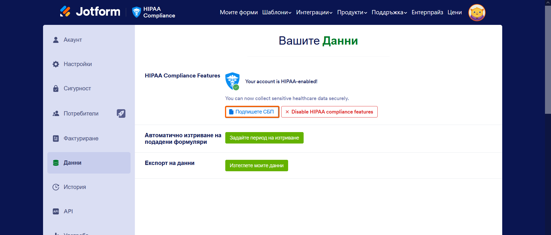 Вие можете да поискате СБП, който е подписан от Jotform, ако желаете. След като активирате функциите за HIPAA съответствие във вашия акаунт, вие можете да поискате СБП от раздела Данни на страницата с Настройки, като щракнете върху бутона „Подпишете СБП“.