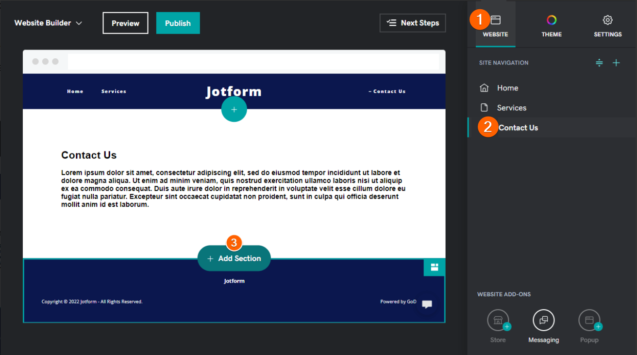 1. Отворете редактора на GoDaddy. Достигнете до страницата, в която искате да вмъкнете формата. И щракнете върху “Добавете секция“.