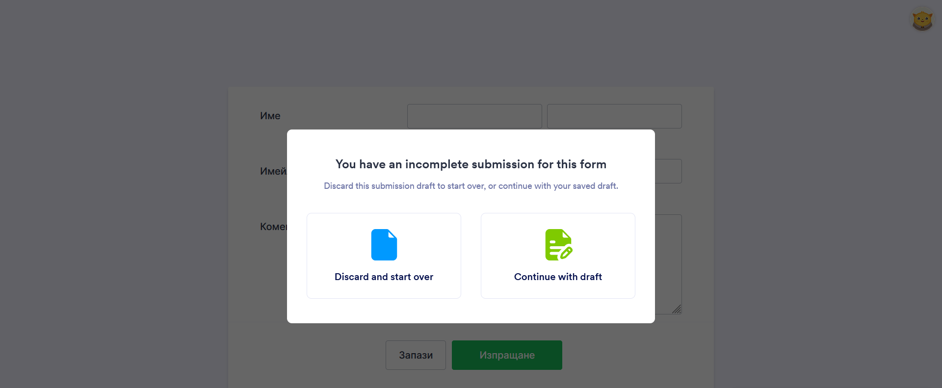Ако попълващ формата получи достъп до вашата форма, докато е влязъл в неговия Jotform акаунт и системата намери съществуваща чернова, той ще види опция да започне отново попълването на вашата форма или да продължи оттам, откъдето е спрял.