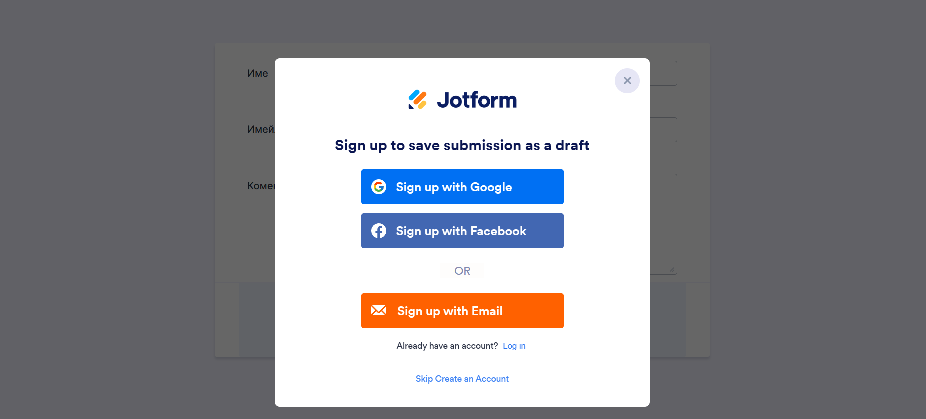 Активирането на Запазване и Продължаване По-Късно добавя бутон Запазване към вашата форма. Бутонът отваря диалогов прозорец за запазване, където вашите попълващи могат да изберат да се регистрират или да влязат в Jotform, за да запазят и лесно да управляват техните чернови в техния акаунт.