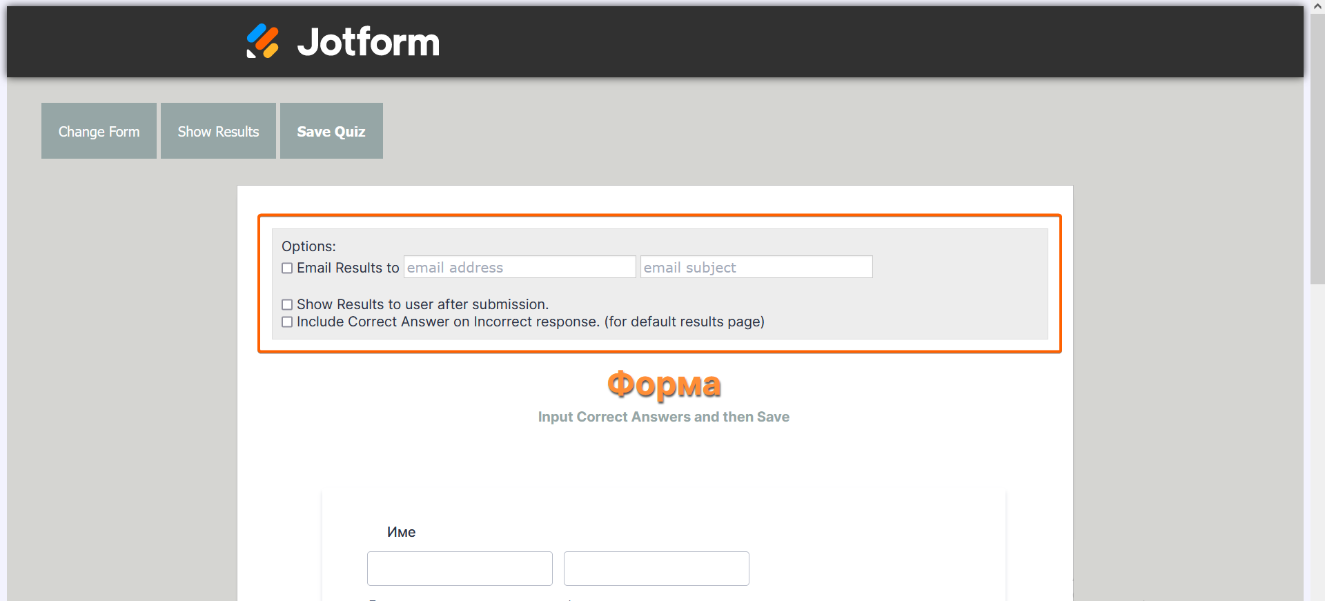 - Показване на резултатите на потребителя след изпращане — Показва страницата с резултати на попълващия формата след щракване върху бутона за изпращане.