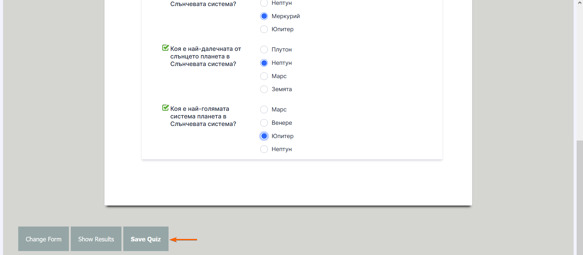 Вие можете да използвате тестова форма, за да превърнете вашата форма в тест или изпит. Формата за тест сравнява въведеното от попълващите на формата с дефинираните от вас правилни отговори и показва резултатите след подаване.