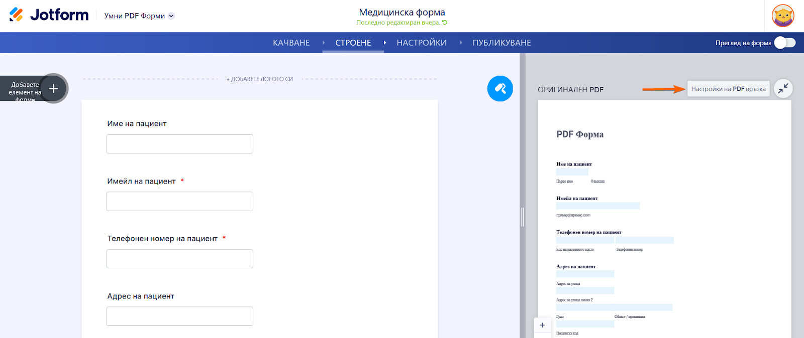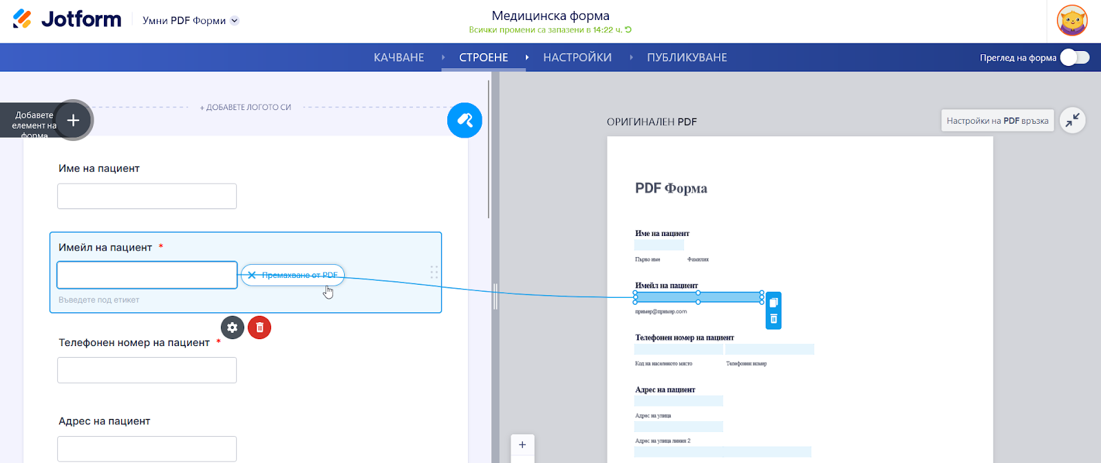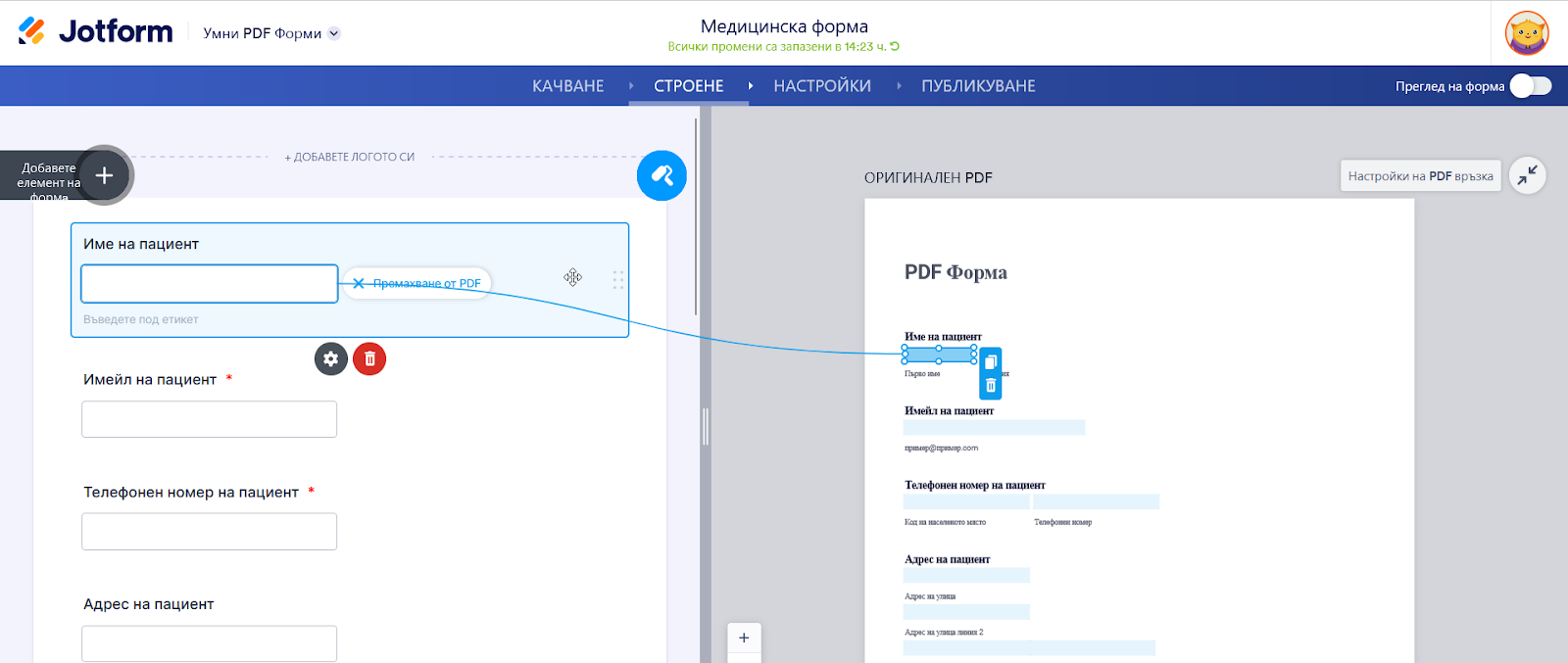 Веднага след като качите PDF в Jotform, можете да направите промени в онлайн формата, като премахнете поле, добавите ново и го свържете към съответното пространство за отговори в PDF формата. Когато някой попълни вашата онлайн форма, изпратените му отговори ще бъдат използвани за автоматично попълване на конкретните полета във вашия оригиналнен PDF файл.