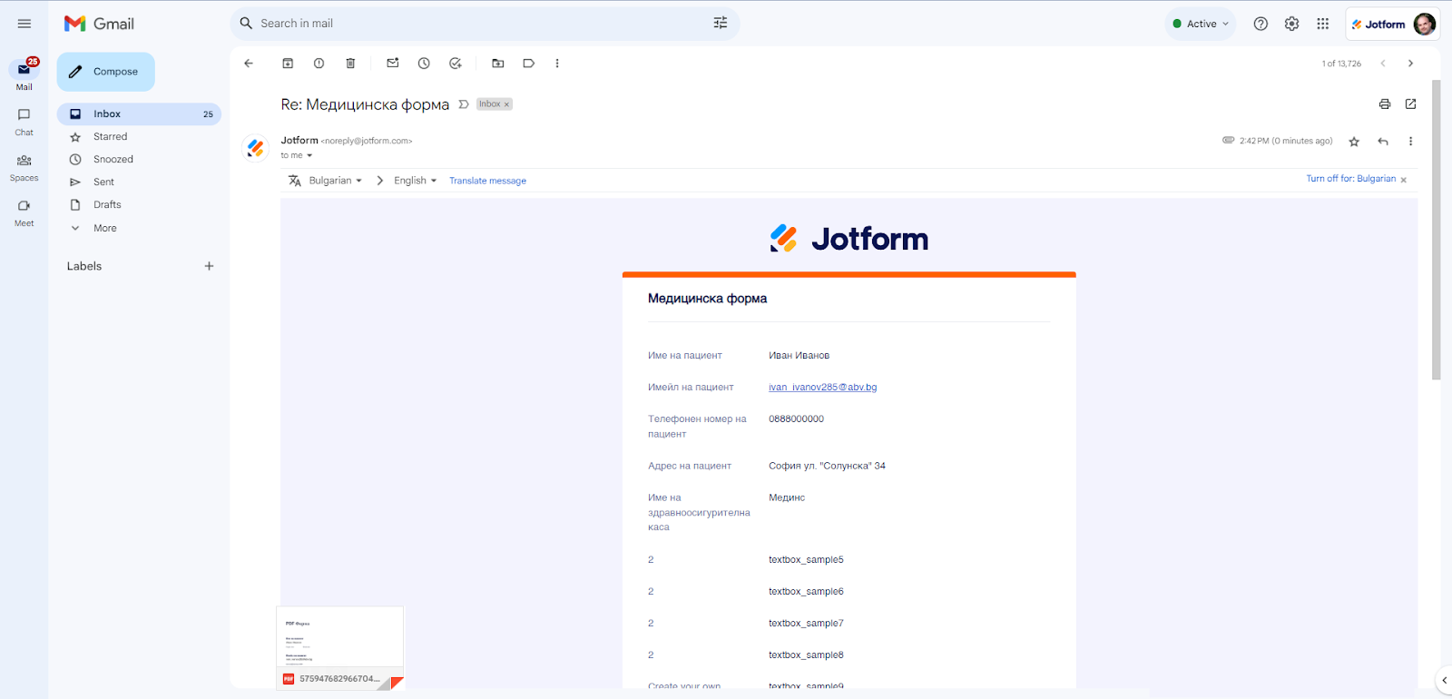 Ако конкретни полета във вашите два инструмента за събиране на данни са свързани, изпратените отговори от вашата онлайн форма ще бъдат използвани за попълване на PDF копието, което сте качили в Jotform.