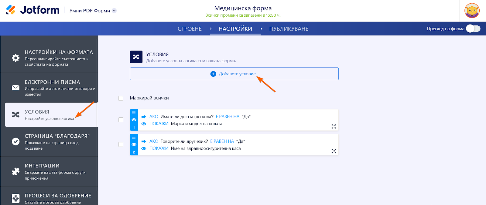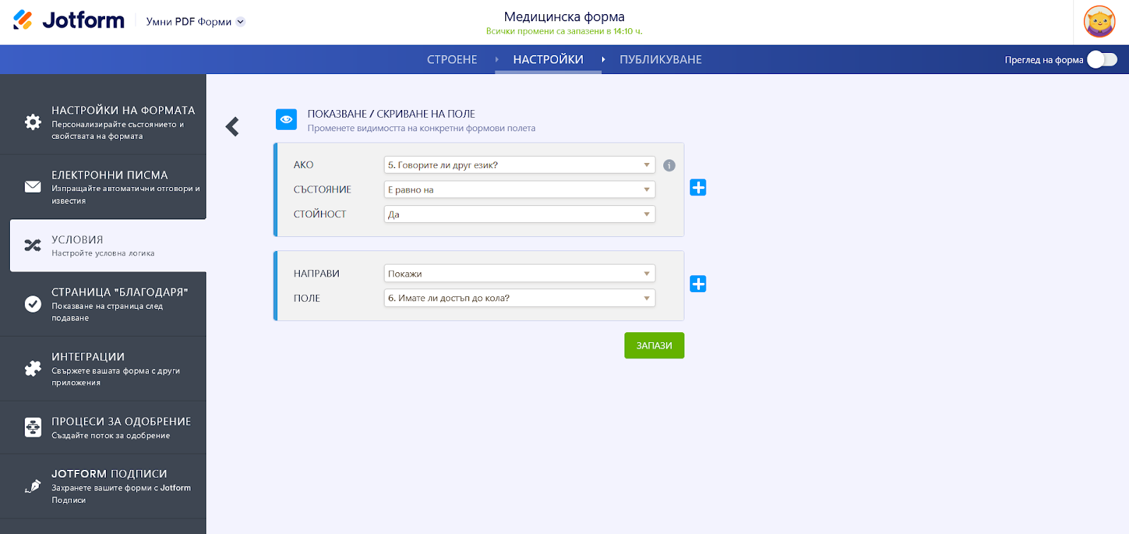 Jotform Умни PDF Форми ви позволява да скриете или покажете произволен брой въпроси, въз основа на нечии предишни отговори. Тази опция спестява време за всички и предотвратява объркването, като позволява на хората да пропускат неуместни въпроси, докато попълват вашата форма.