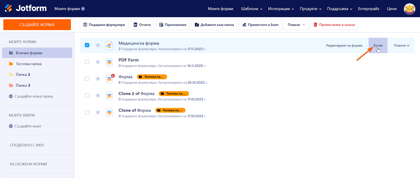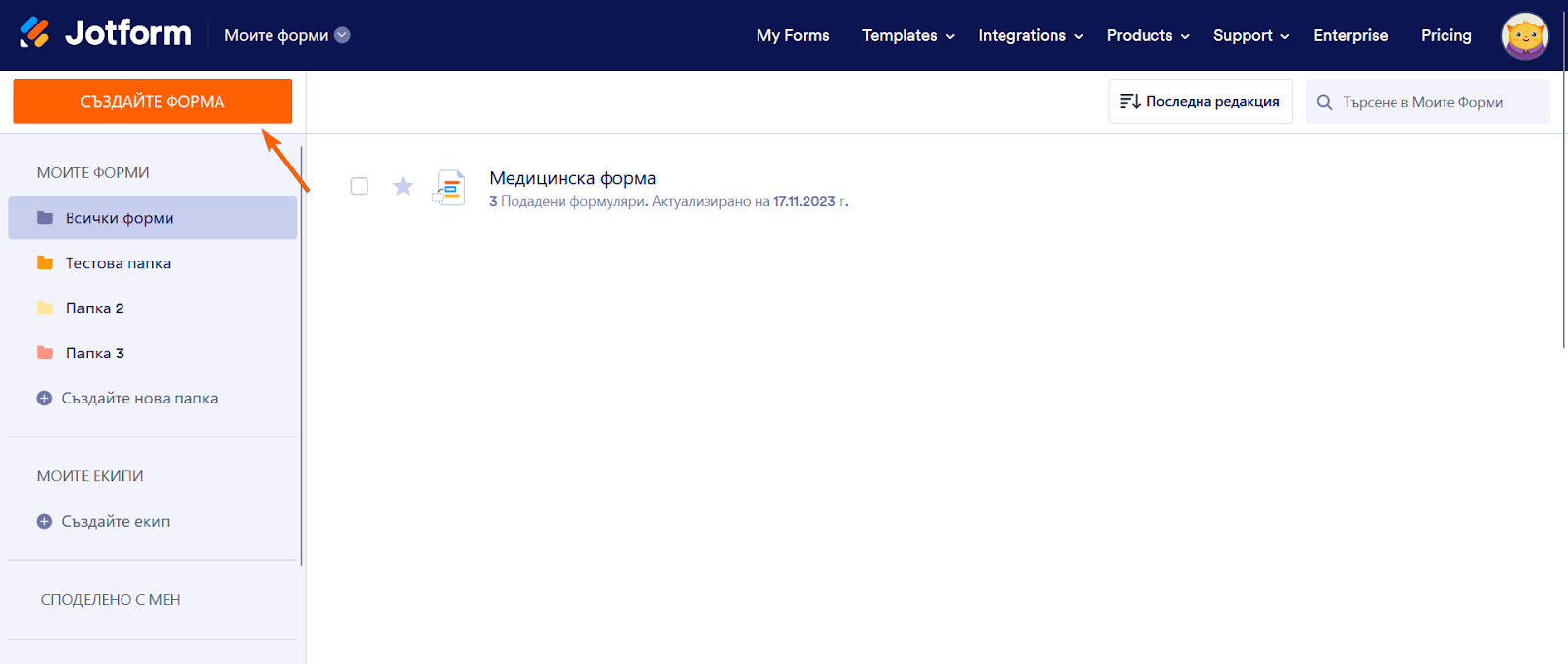 1. Започнете, като щракнете върху бутона “Създайте форма” в горния ляв ъгъл на вашата страница “Моите форми” в JotForm.