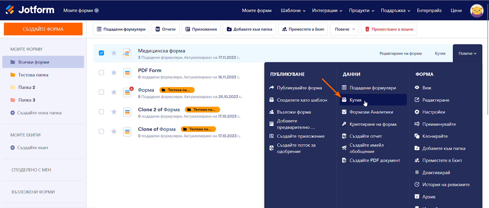 След като качите PDF форма в Jotform, създадете нейна персонализируема онлайн версия и я споделите с хора, всяка подадена информация се архивира под тази конкретна форма в Jotform Кутия.