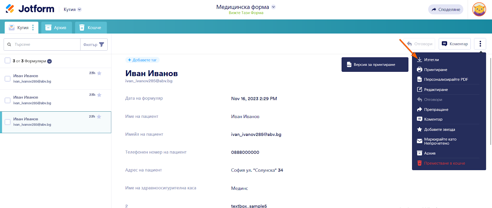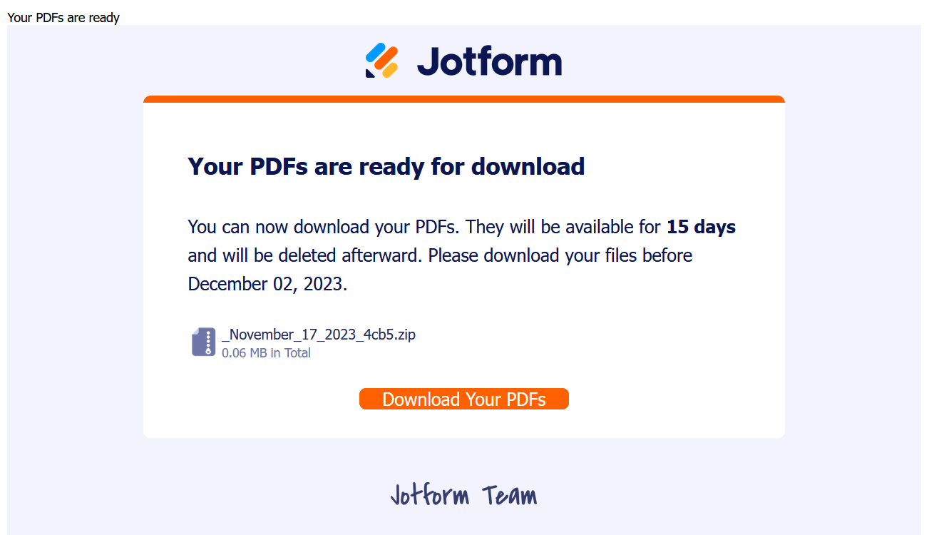 Jotform Кутия също така предоставя опция за изтегляне на копия на вашата оригинална PDF форма, попълнена с информация, която е събрана чрез онлайн формата, който сте създали в JotForm.