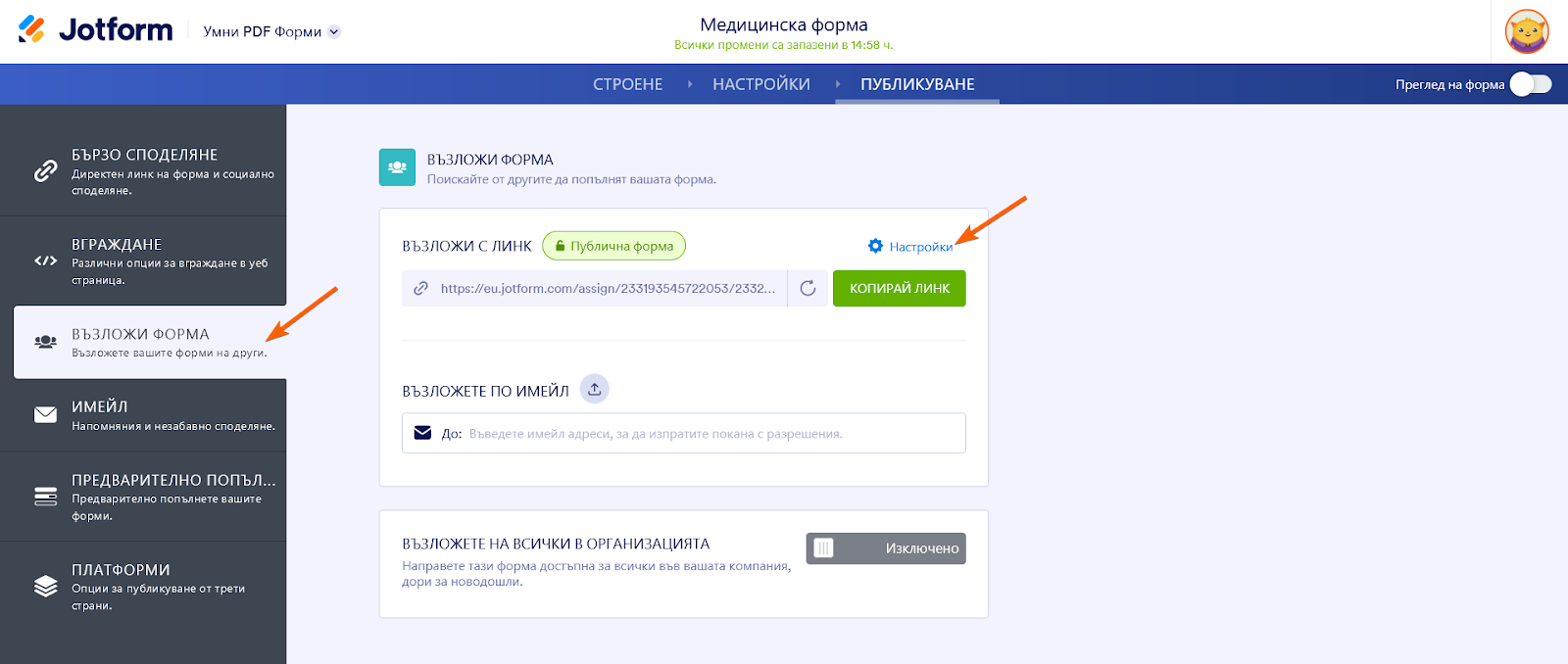 Jotform Умни PDF Форми също предлага широка гама от опции за споделяне на форми, така че да можете да контролирате как се споделят вашата онлайн форма и попълняема PDF форма.