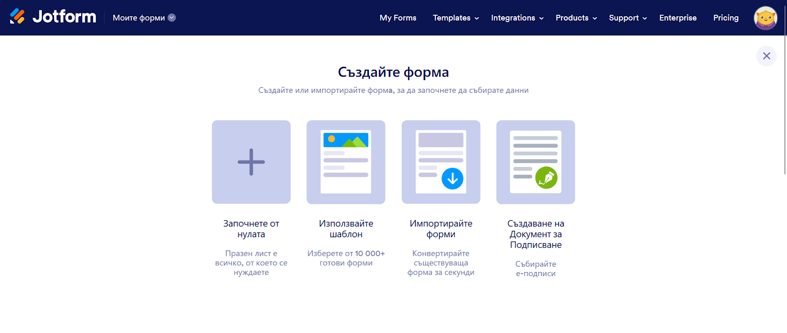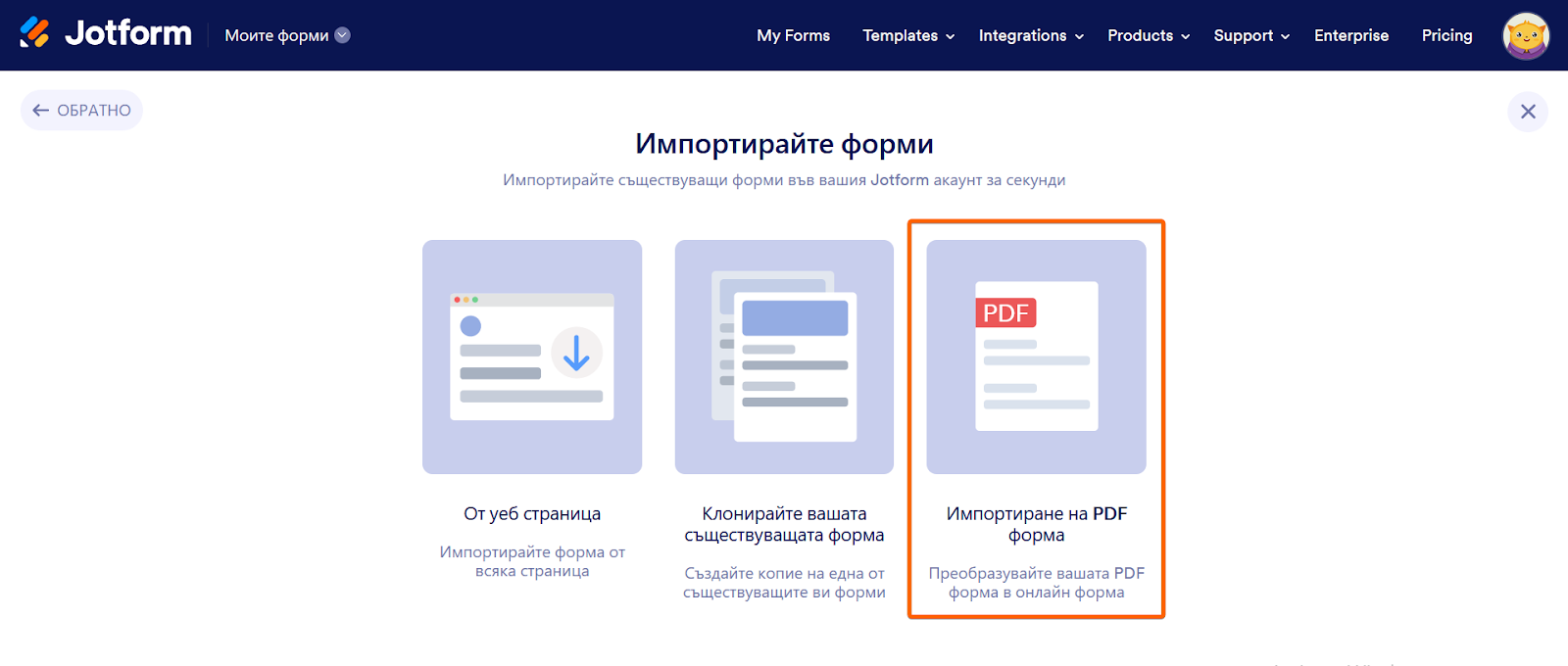 2. Изберете опцията “Импортирайте Форма“, за да качите PDF форма и да създадете нейна онлайн версия в JotForm.
