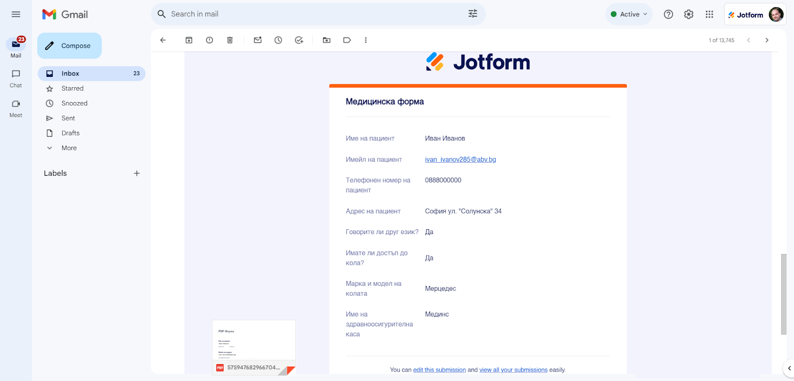 Всеки път, когато онлайн формата се попълва, входящите отговори се архивират във вашия Jotform акаунт и се използват за попълване на оригиналната PDF форма.